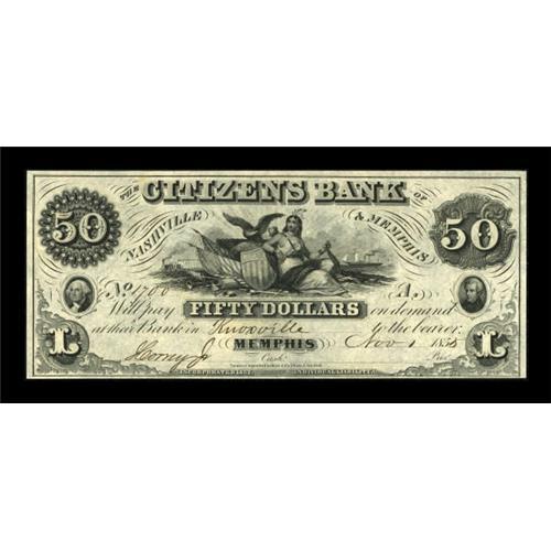 <B>Memphis, TN- Citizens Bank of Nashville and Memphis </B></I>$50 Nov. 1, 1855 G30, Garland 453<BR> This gorgeous example is likely the finest we've handled. The paper is original and attractive with bold penned information. Only the president's signature is missing. <B>Crisp Uncirculated </B></I>with a hint of stamp hinge glue on back.<BR><BR><b>Shipping:</b> Coins & Currency (<a target="_blank" href="http://www.heritageauctions.com/common/shipping.php">view shipping information</a>)