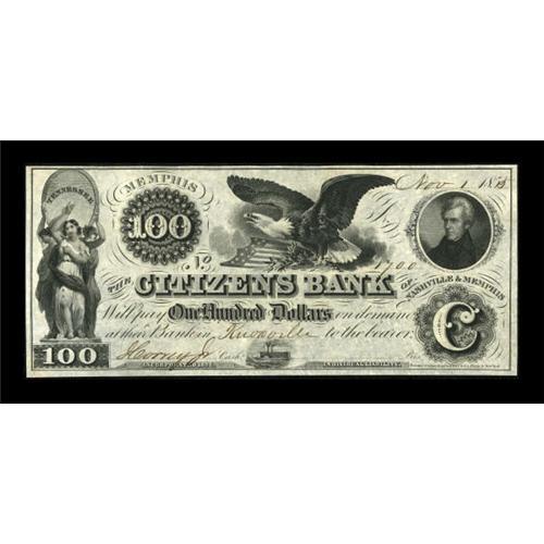 <B>Memphis, TN- Citizens Bank of Nashville and Memphis </B></I>$100 Nov. 1, 1855 G32, Garland 454<BR> A pleasing piece that is wholly original and problem free. The penned details are bold including the payable at Knoxville clause. <B>Choice Crisp Uncirculated.</B></I><BR><BR><b>Shipping:</b> Coins & Currency (<a target="_blank" href="http://www.heritageauctions.com/common/shipping.php">view shipping information</a>)