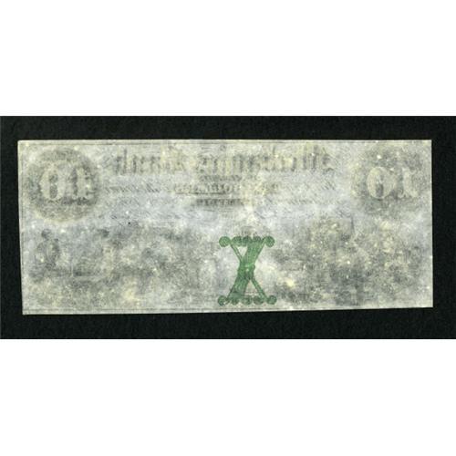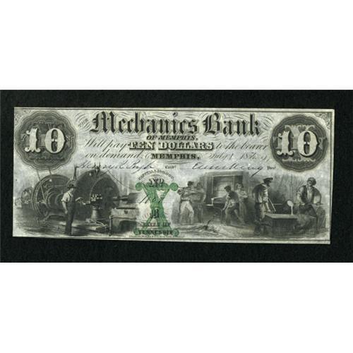 <B>Memphis, TN- Mechanics Bank of Memphis </B></I>$10 July 1, 1854 G8f<BR> Fully signed and issued, this boldly printed note likely never circulated as there are no traces of circulation. There is a tiny corner tip fold that limits the grade. <B>Choice About Uncirculated. </B></I><BR><I>From The Collection of a Louisiana Gentleman</B></I><BR><BR><b>Shipping:</b> Coins & Currency (<a target="_blank" href="http://www.heritageauctions.com/common/shipping.php">view shipping information</a>)