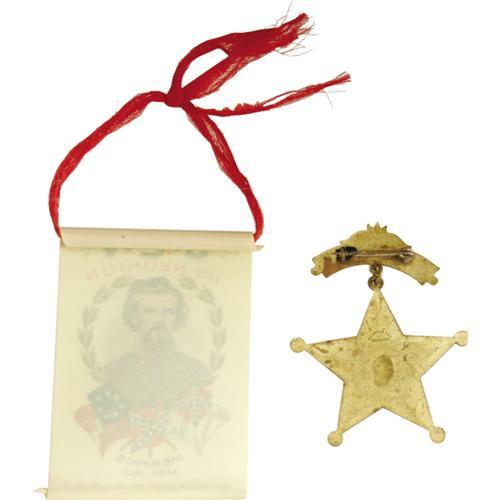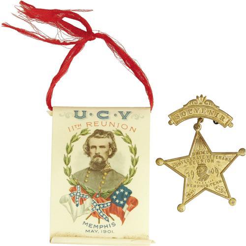 <B>Memphis, Tennessee U.C.V. Reunion Souvenirs 1901, 1909.</B></I> The United Confederate Veterans was an organization founded in 1889 as an association for Confederate veterans of the Civil War. They gathered on a regular basis both nationally and regionally for reunions in various locations, often getting together with their Union counterparts, the G.A.R. The first item is an interesting celluloid "scroll" (2" x 2.75") with a red hanger ribbon at the top. The color image is of a Tennessee native, CSA General Nathan Bedford Forrest inside a laurel wreath above three different flying Confederate flags. The text states "U.C.V. 11th Reunion" at the top and "Memphis May, 1901" at the bottom. Forrest was a controversial figure- a brilliant cavalry tactician who got involved with the Ku Klux Klan after the war and was elected their first Grand Wizard in 1867. He was known though to be very generous to his former comrades who went to him for aid after the war. He is buried at Forrest Park in Memphis. <BR><BR>The second item is a souvenir medal from the 1909 UCV reunion held also in Memphis. A likeness of the beloved CSA General Robert E. Lee is centered in this star-shaped 2" medal hanging from a pin. Both items are in excellent condition.