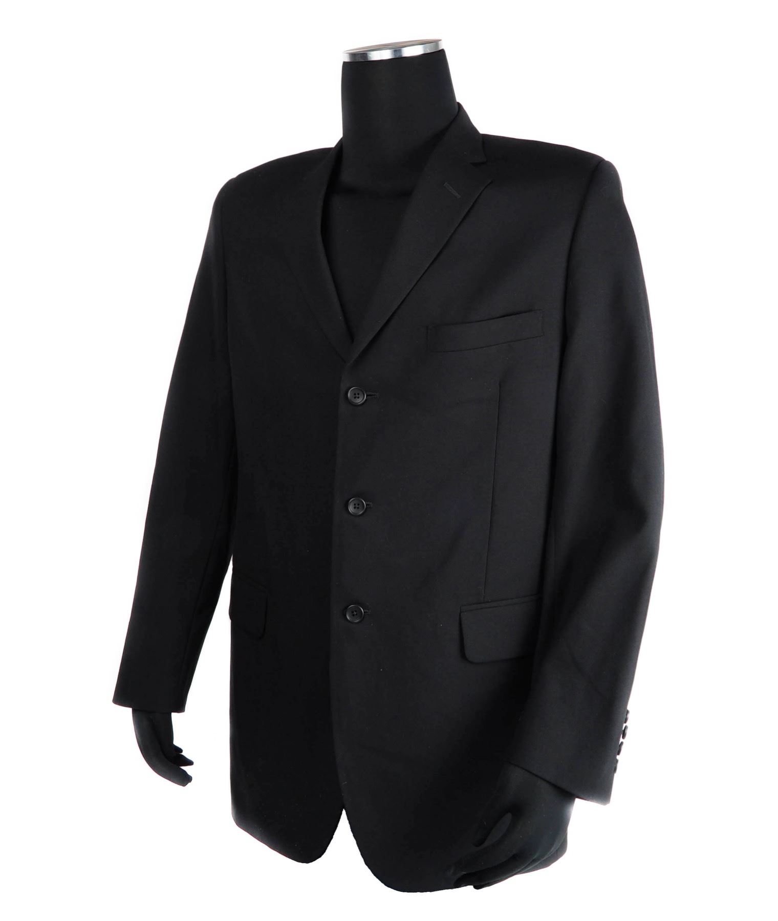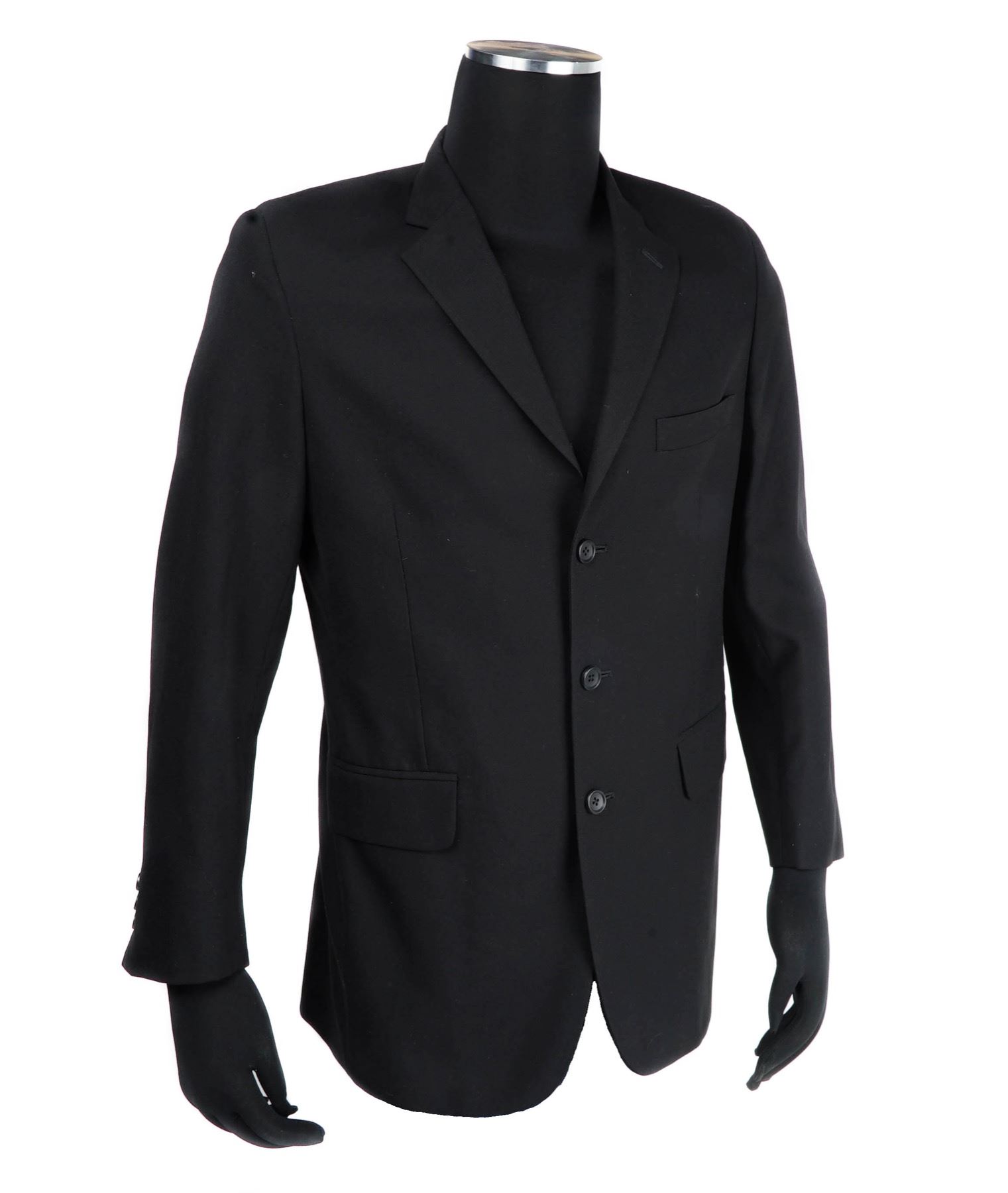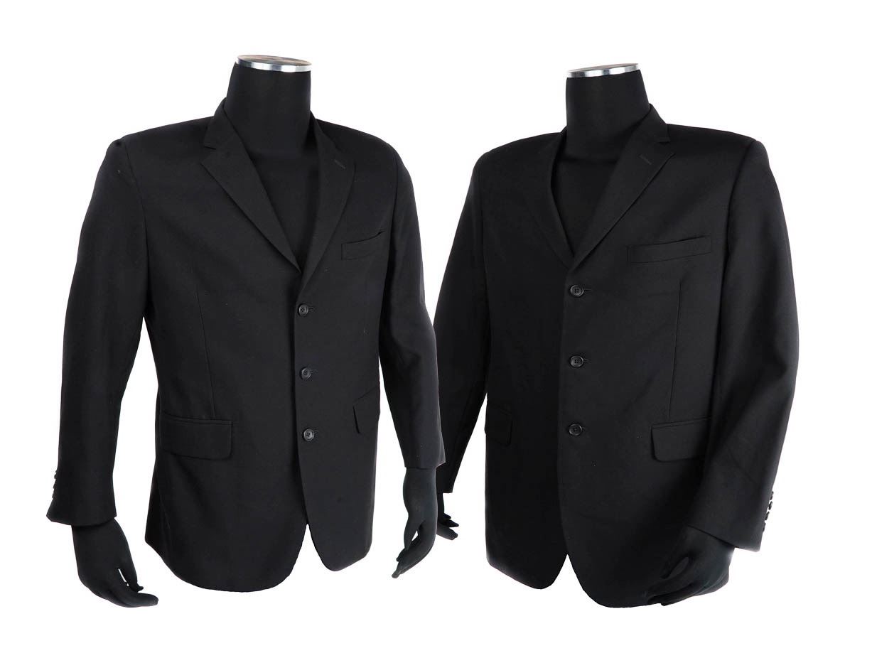 Set of two agent suit jackets featured in the 1997 science fiction film Men In black. A police officer joins a secret organization that polices and monitors extraterrestrial interactions on Earth. This set features two black satin suit jackets. Each piece was custom made for the actor and does not feature a size. Both jackets features a black silk lining, button up front, and one jacket features a Western Costume Company tag on the inside. These set remains in excellent, production used condition.