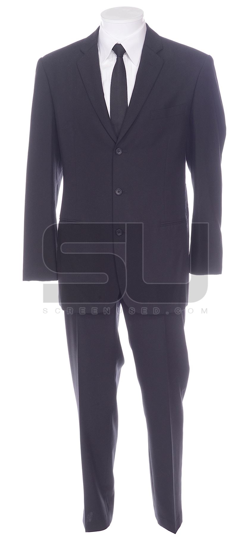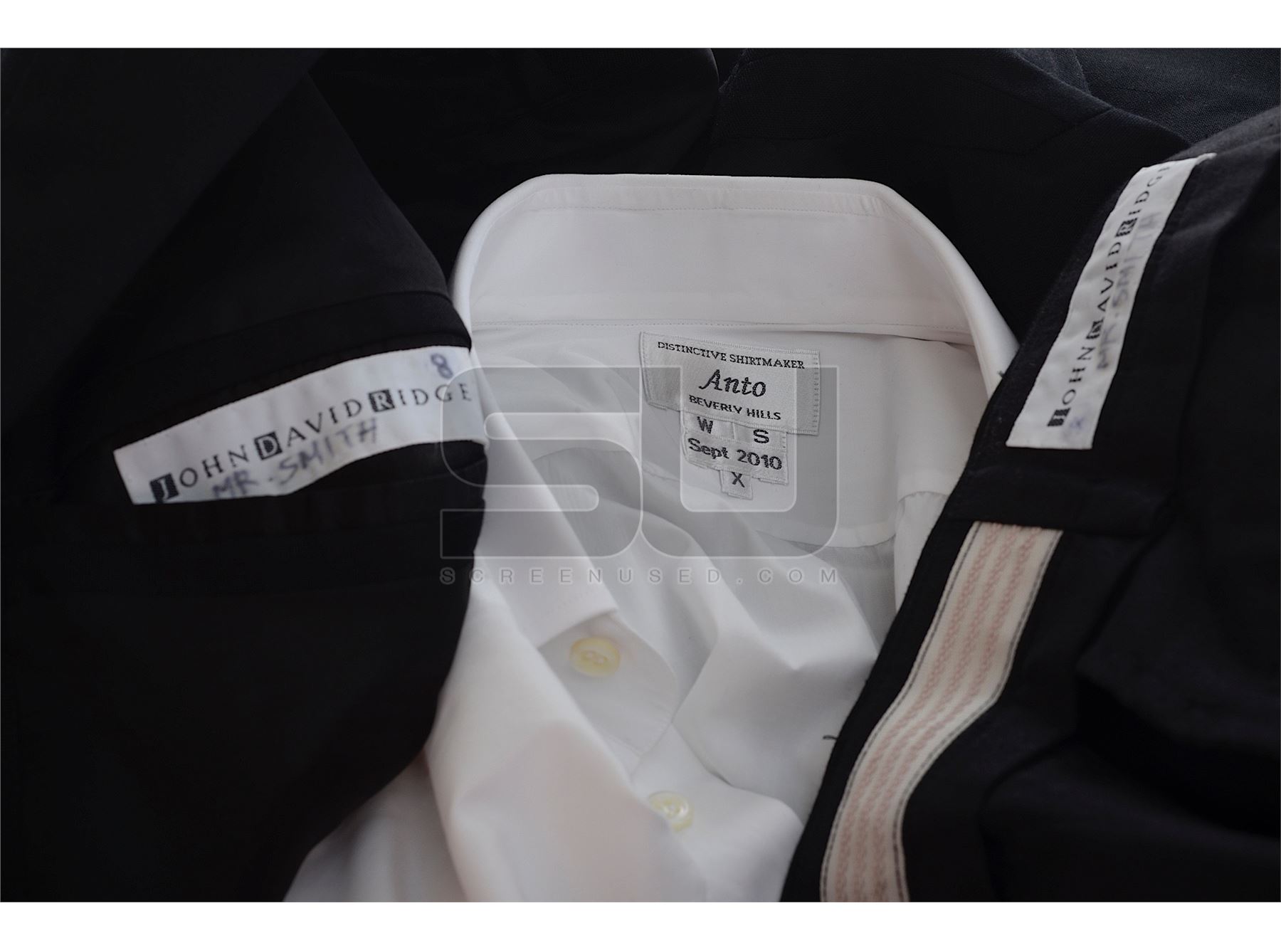 This suit was acquired by the production for use by Will Smith as "Agent J". This suit consists of a white dress shirt that was Anto made with the initials "WS" in the collar, black jacket, black pants with "Mr. Smith" written in the waist and a black tie.
