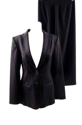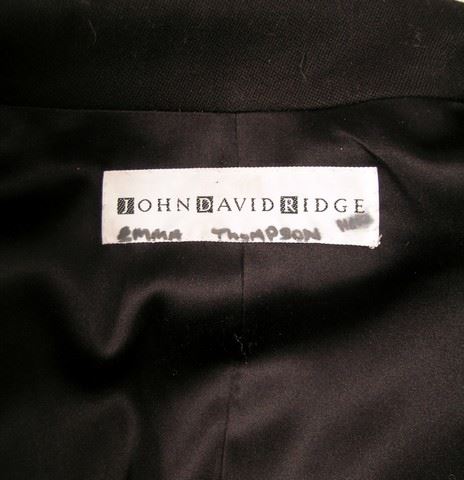 From Men in Black 3 (2012), this is the hero complete screen used costume for Agent O (Emma Thompson). Included is her black two button 'John David Ridge' suit jacket, long skirt, and short skirt. The costume department has written Emma Thompson inside jacket.