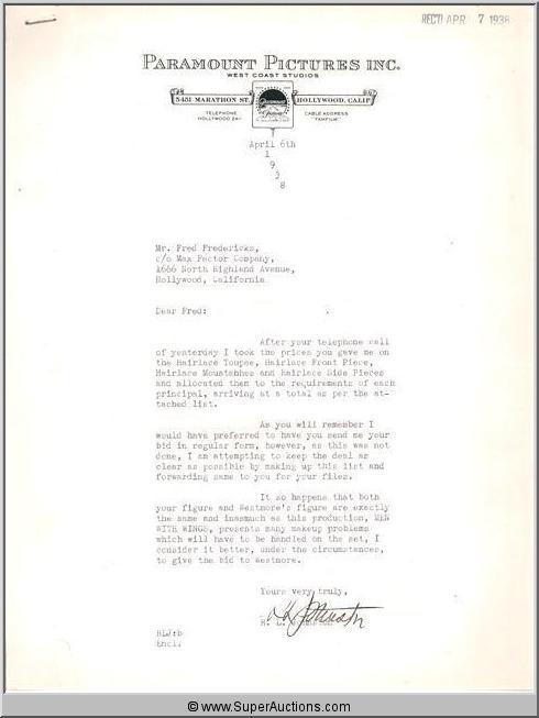 "Men With Wings" / Released January 10, 1939 / Paramount Pictures Inc./ "A Lavish Air Spectacle In Technicolor" / Starring: Fred MacMurray, Ray Milland, Louise Campbell, Andy Devine and Lynne Overman / Folder contains letter from Paramount Studios to Mr. Fred Fredericks c/o Max Factor Company dated April 6, 1938 explaining that they are declining Max Factors bid and using Westmore. {Max Factor Collection}