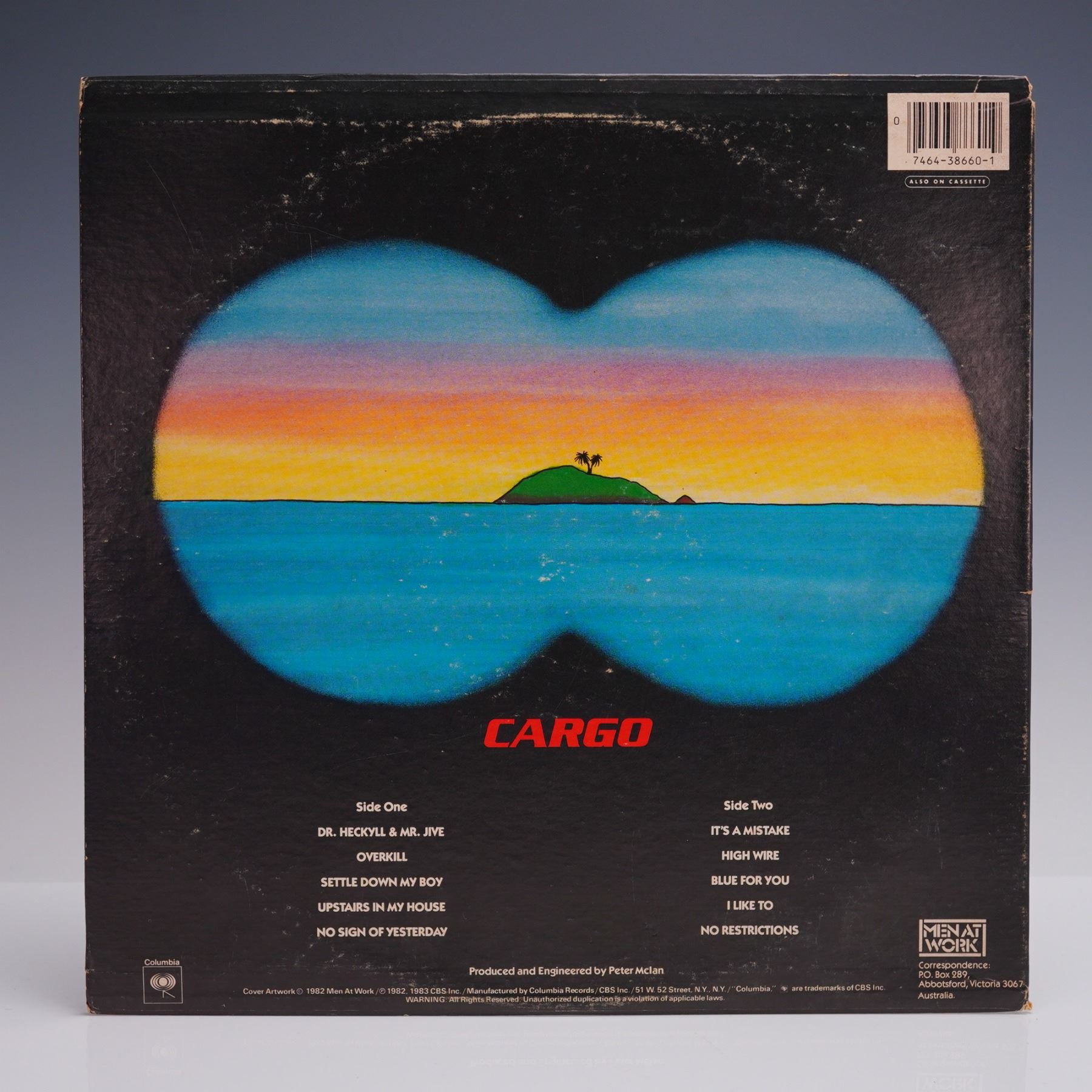 Men at Work - Cargo vinyl LP album, released in 1983 on Columbia Records (QC 38660). This second studio album from the Australian rock band includes standout tracks such as Overkill, It's a Mistake, and Dr. Heckyll & Mr. Jive, blending catchy pop hooks with subtle political and emotional themes. Produced by Peter McIan, the album helped cement the band's international success following their breakthrough debut. The front cover features vibrant, cartoon-style artwork depicting a tropical island scene with a parachuting crate and scattered mechanical debris, while the back shows a serene sunset vista through a pair of binoculars. Includes the original inner sleeve with band portrait. Vinyl bears the red Columbia label and appears clean; jacket shows minor edge and surface wear from age.
