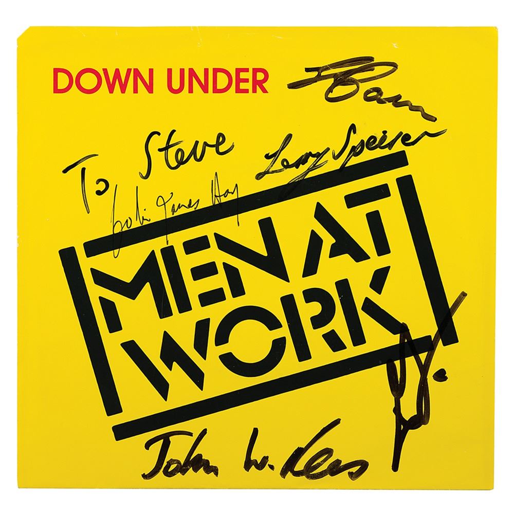Columbia Records 45 RPM single record for 'Down Under / Anyone for Tennis?' by Men at Work, signed on the front of the sleeve in black felt tip by Colin Hay, Jerry Speiser, John Rees, Greg Ham, and Ron Strykert, with an inscription, "To Steve." In very good to fine condition, with light creasing to the sleeve. The record is included.