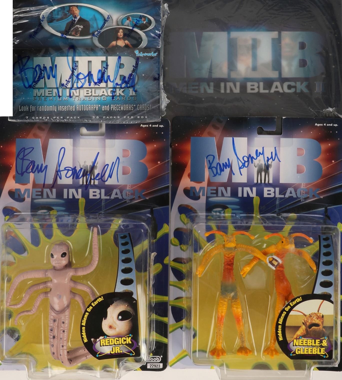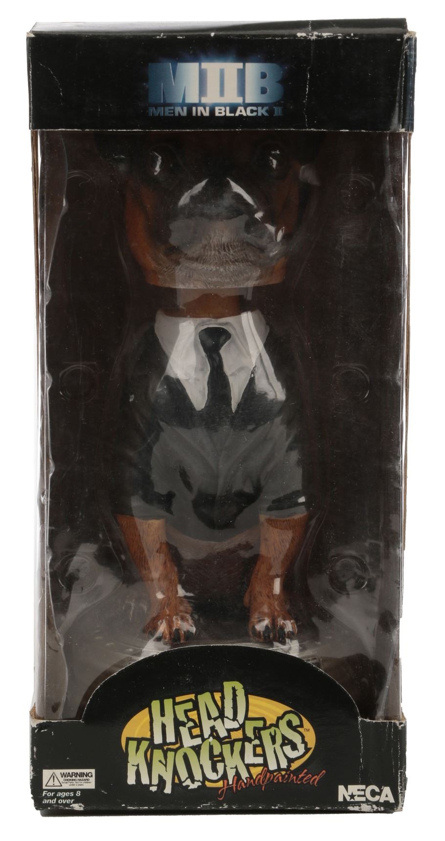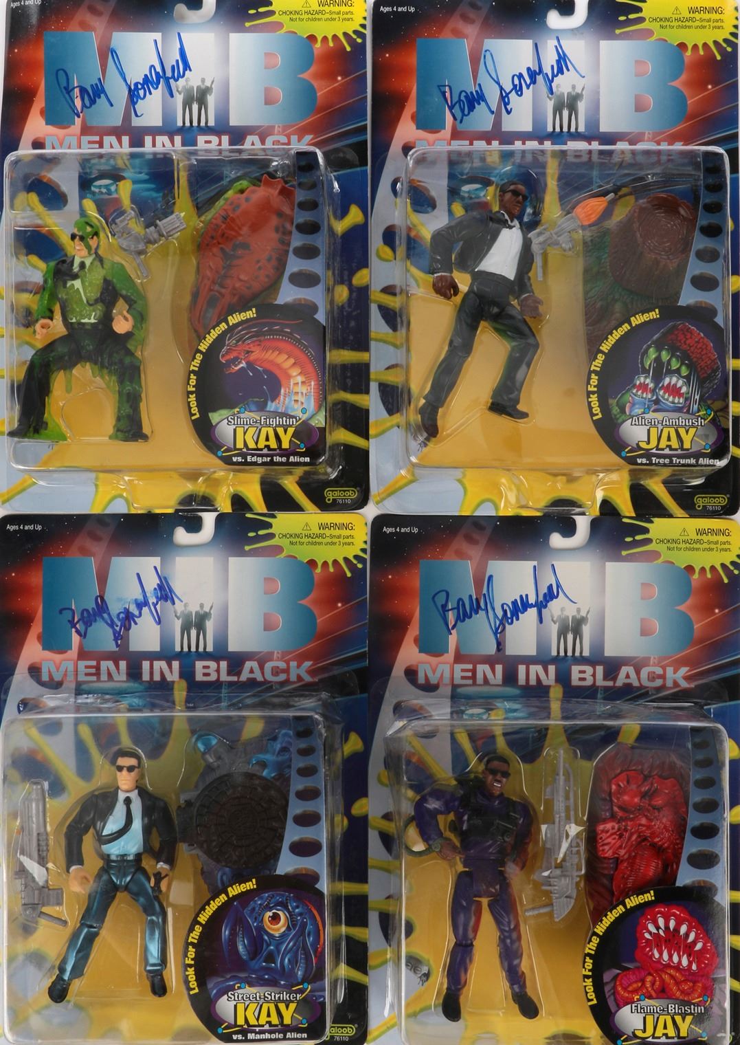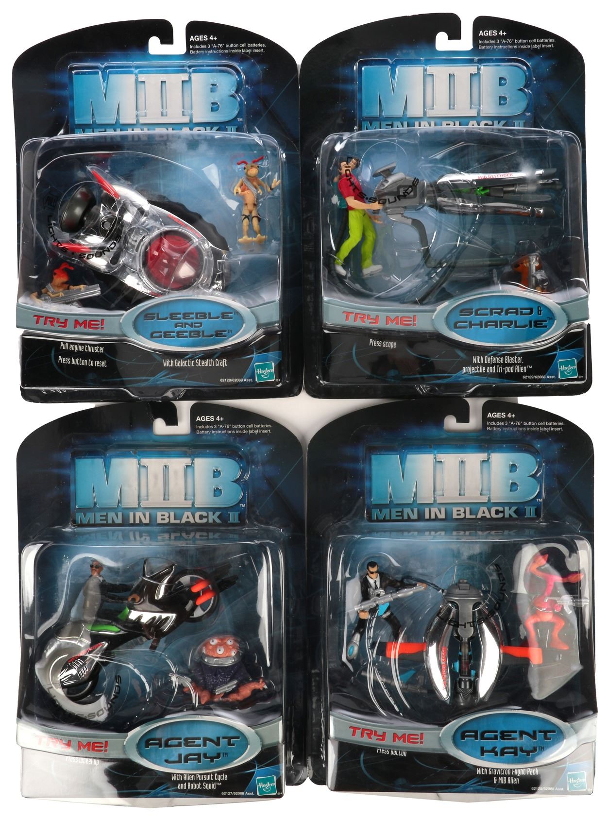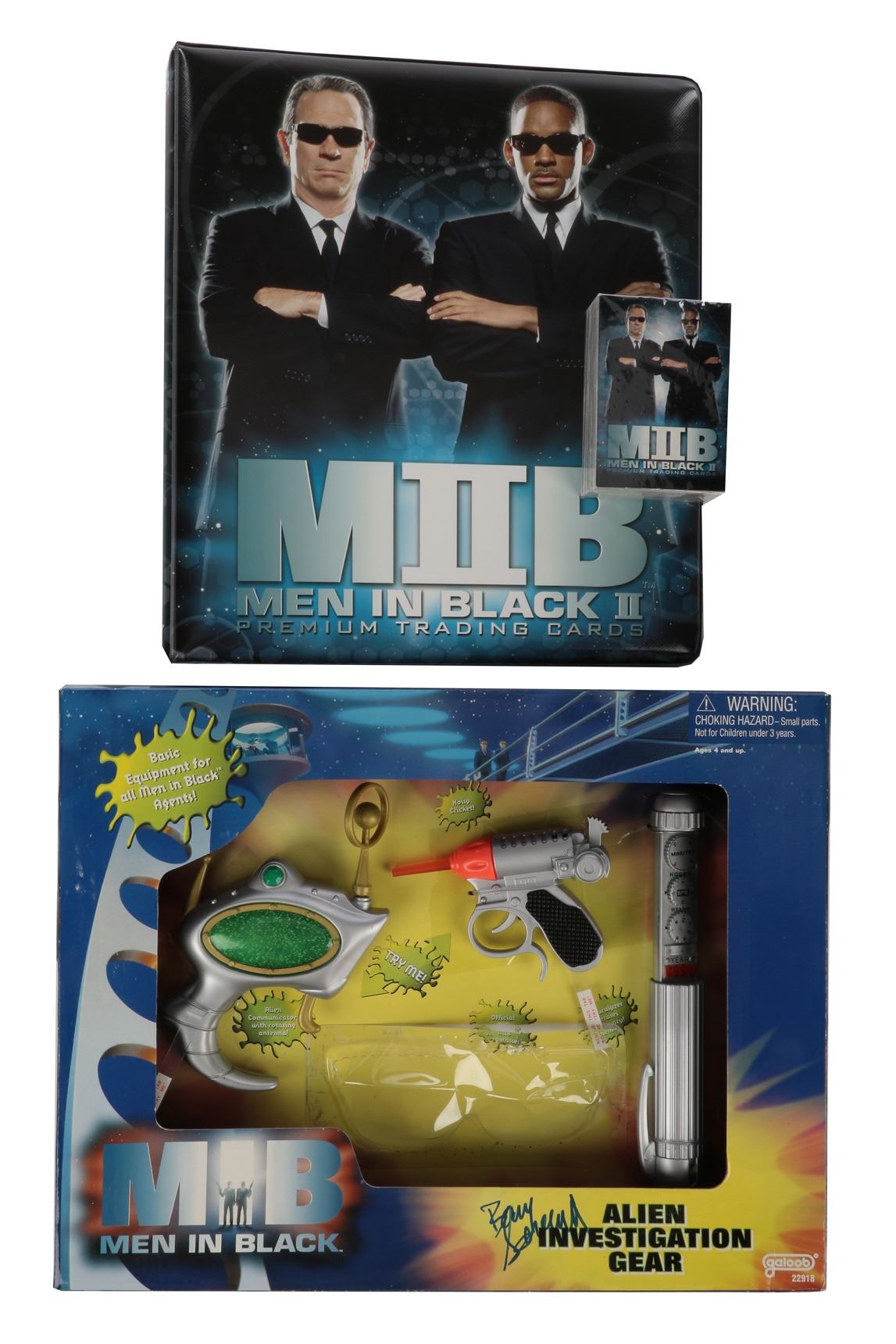 491. Men in Black and MIB II large lot of (40) action figures, trading cards & more. (1990s-2000s) Original (40) Men in Black-related commercial merch including (27) Galoob Men in Black action figures in sealed blister packs, (1) Men in Black "Alien Investigation" playset by Galoob, (2) MIB II Premium Trading Card binders (filled), (2) decks of MIB II trading cards, (1) box of 36-MIB II trading card packs, (1) MIB II "Frank the Pug" bobble head, (4) Hasbro MIB II figures in sealed blister packs, and (2) MIB II lenticulars. Some packaging exhibiting handling (Frank the Pug box is crushed). In generally very good to fine condition. From the collection of Barry Sonnenfeld. $300 - $500