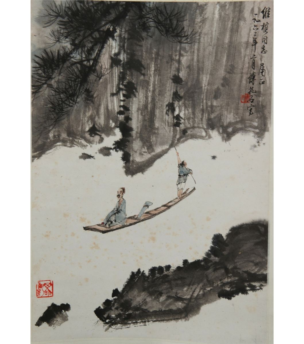 Men on boat, hanging scroll, Chinese ink and watercolour on paper, signed Fu Baoshi (1904-1965) with red seals, dated 1962; 44 cm x 31 cm