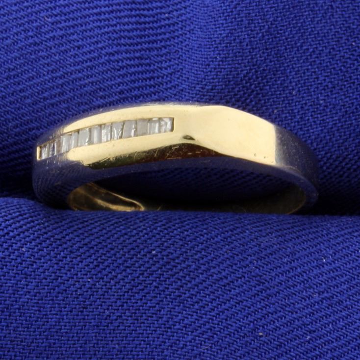 In 14k yellow gold this men's diamond band contains .5 ct total weight of baguette diamonds. Size 10      4.3g