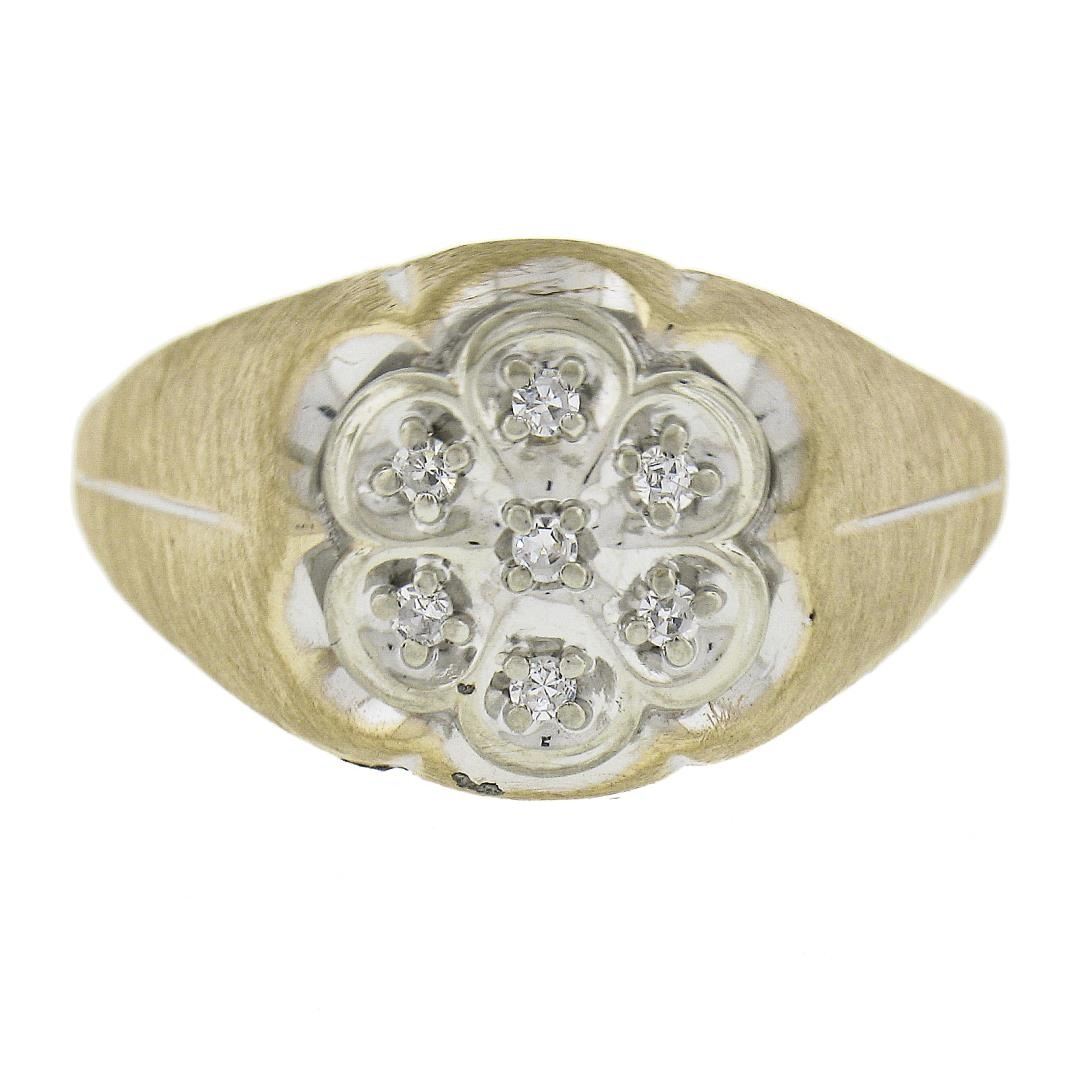 A solid 10k yellow & white gold men's ring, with 7 single cut natural diamonds (G/H - SI1/SI2 ; 0.10ctw). The ring is size 12.5, weighs a total of 4.34 grams, and measures 13.6mm wide.