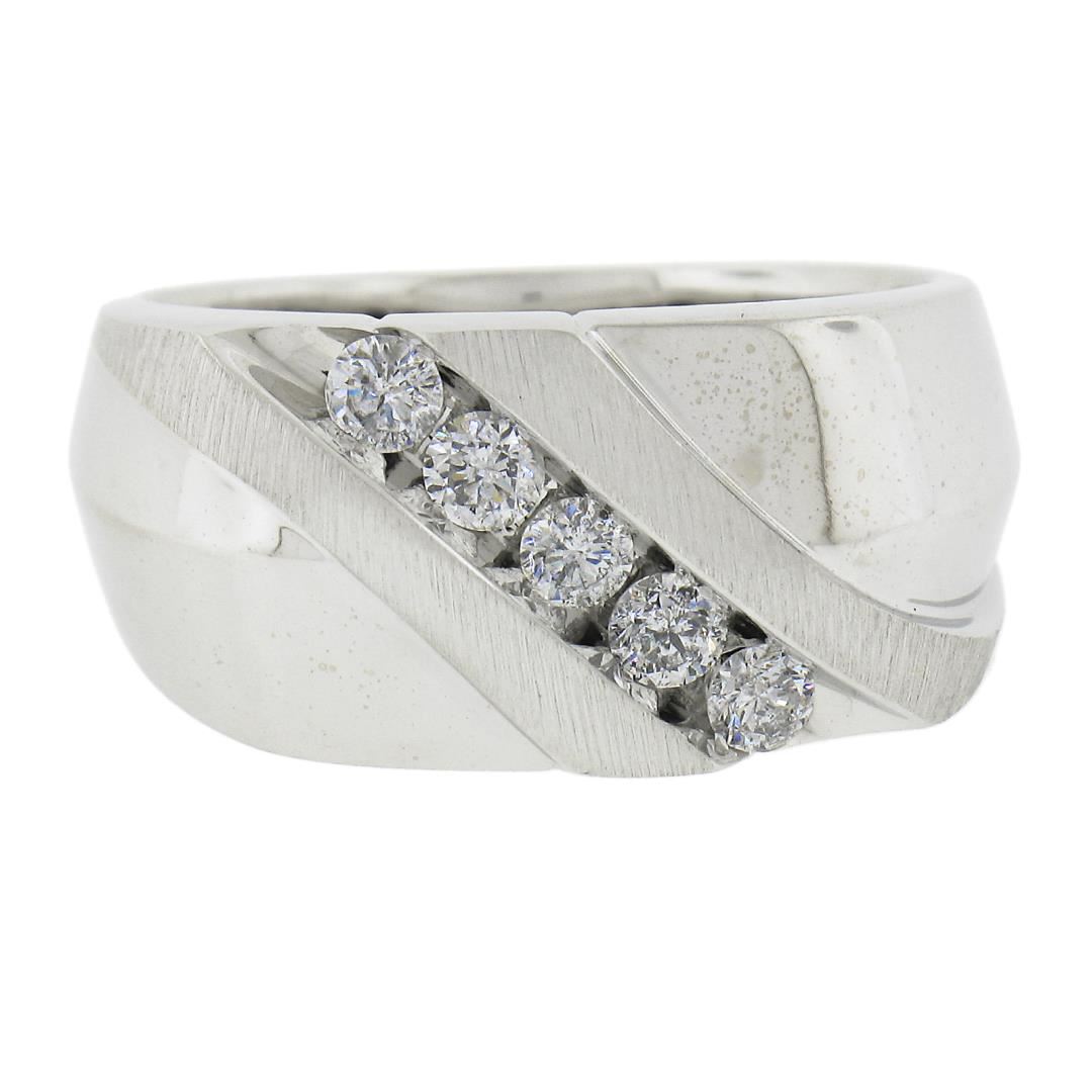 A solid 10k white gold men's band ring, with 5 round cut natural diamonds ( G/H - SI2-I2 ; 0.40ctw). The ring is size 10.0, weighs a total of 7.68 grams, and measures 11.6mm wide.