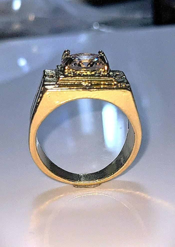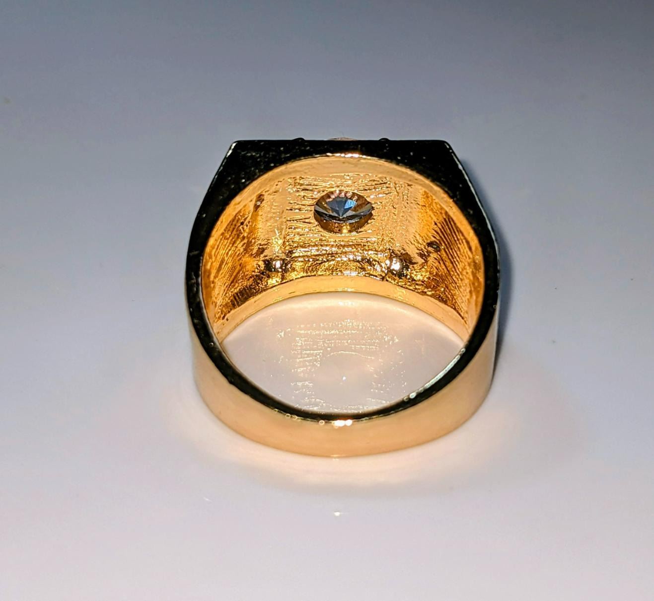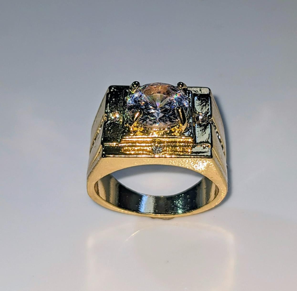 Men's Bold 14 Kt Yellow Gold Plated 3.5 Ct VVs1 Lab Simulated Diamond Ring. The center-stone is a 8.5 mm. Brilliant Round Cut, It is bursting out with a full spectrum of colors. This Ring is complimented with 18 individual 1.2 mm. faceted clear accent stones. These gems are mounted in Tri-Layered 14 Kt Yellow Gold Plate. The ring is a size 10 and the total gram wt.is 14 Grams.