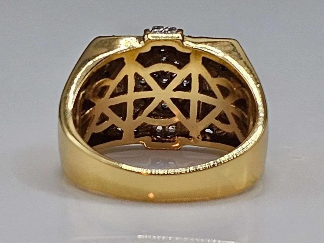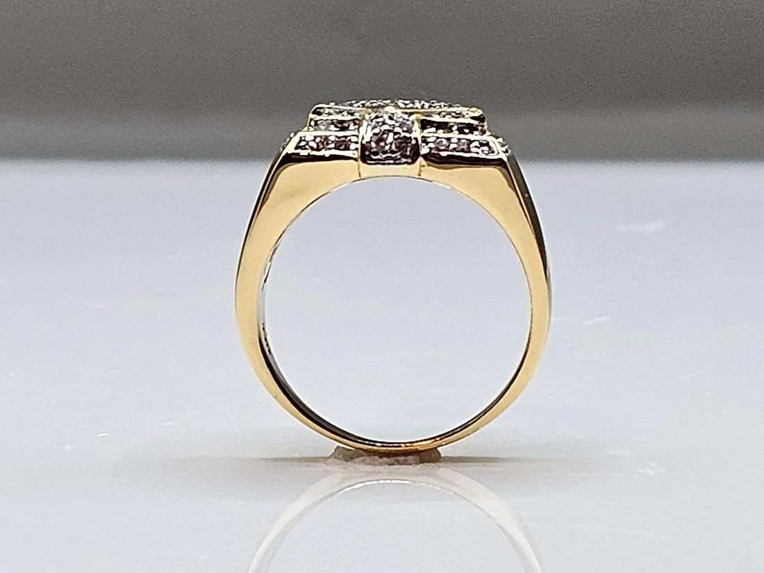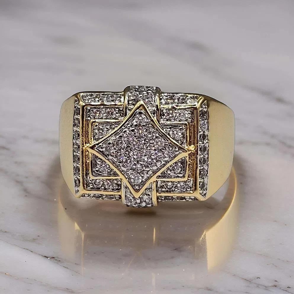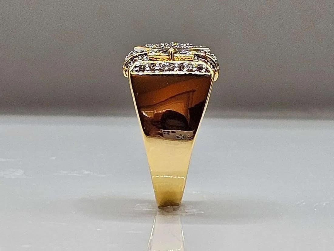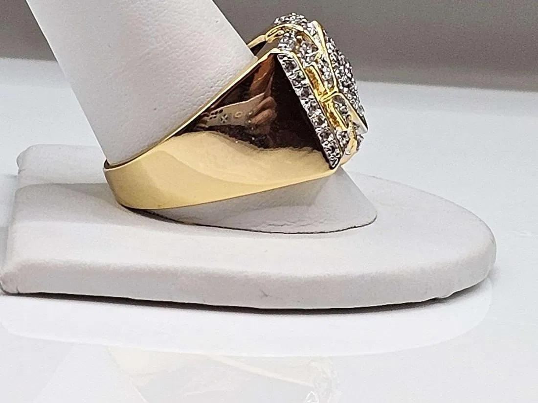 One Men's Handsome 14 Kt 5.75 Ct. Lab Simulated Diamond Ring. These Sparkling Gemstones are all VVs1 Near Flawless and Mounted in 14 Kt. Tri-Layered Yellow Gold, This ring is well made with strong detail. It's Hard To Find A-1 Quality Big Man's Size 9.5. Total gram Wt. is approx. 13.3 total grams. This Ring Is Incredible. Don't Miss It!