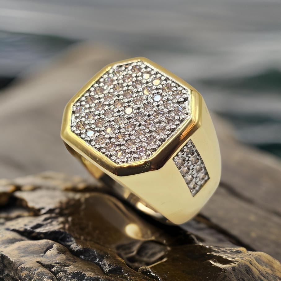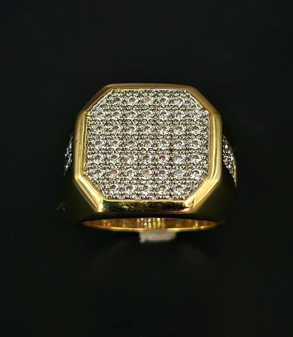 One Men's Handsome 14 Kt 6.25 Ct. Lab Simulated Diamond Ring. These Sparkling Gemstones are all VVs1 Near Flawless and Mounted in 14 Kt. Tri-Layered Yellow Gold, This ring is well made with strong detail. Hard To Find A-1 Quality Big Man's Size 10. The Total Gram Wt. is A Stealth 16.7 Total Grams. This Ring Is Incredible. Don't Miss It!