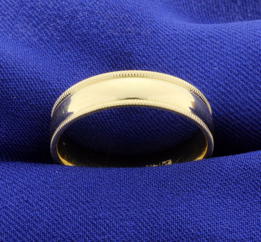 The ring is 14K yellow gold and is 5.9mm wide, it is a size 11 1/2. 7.5g