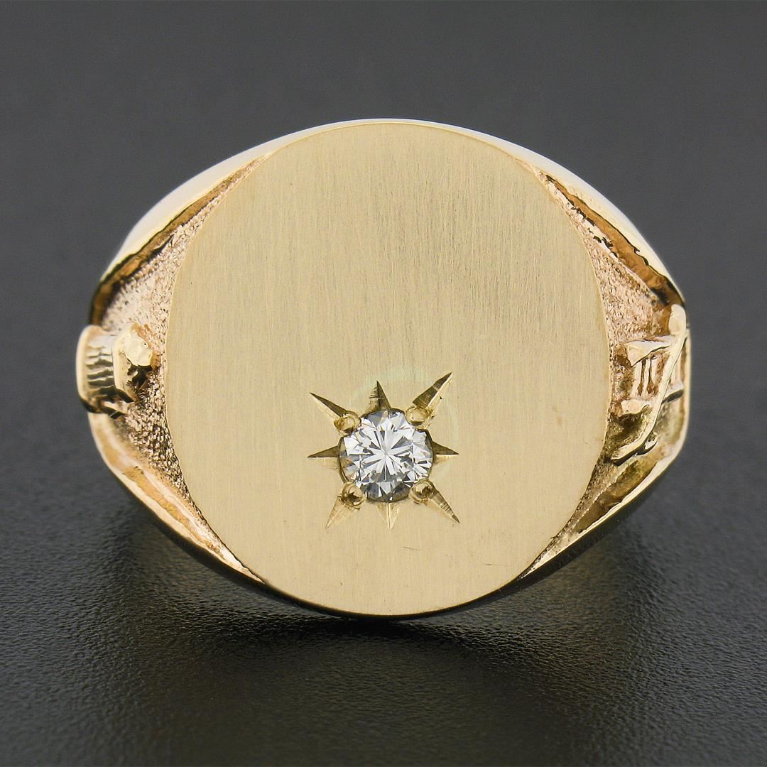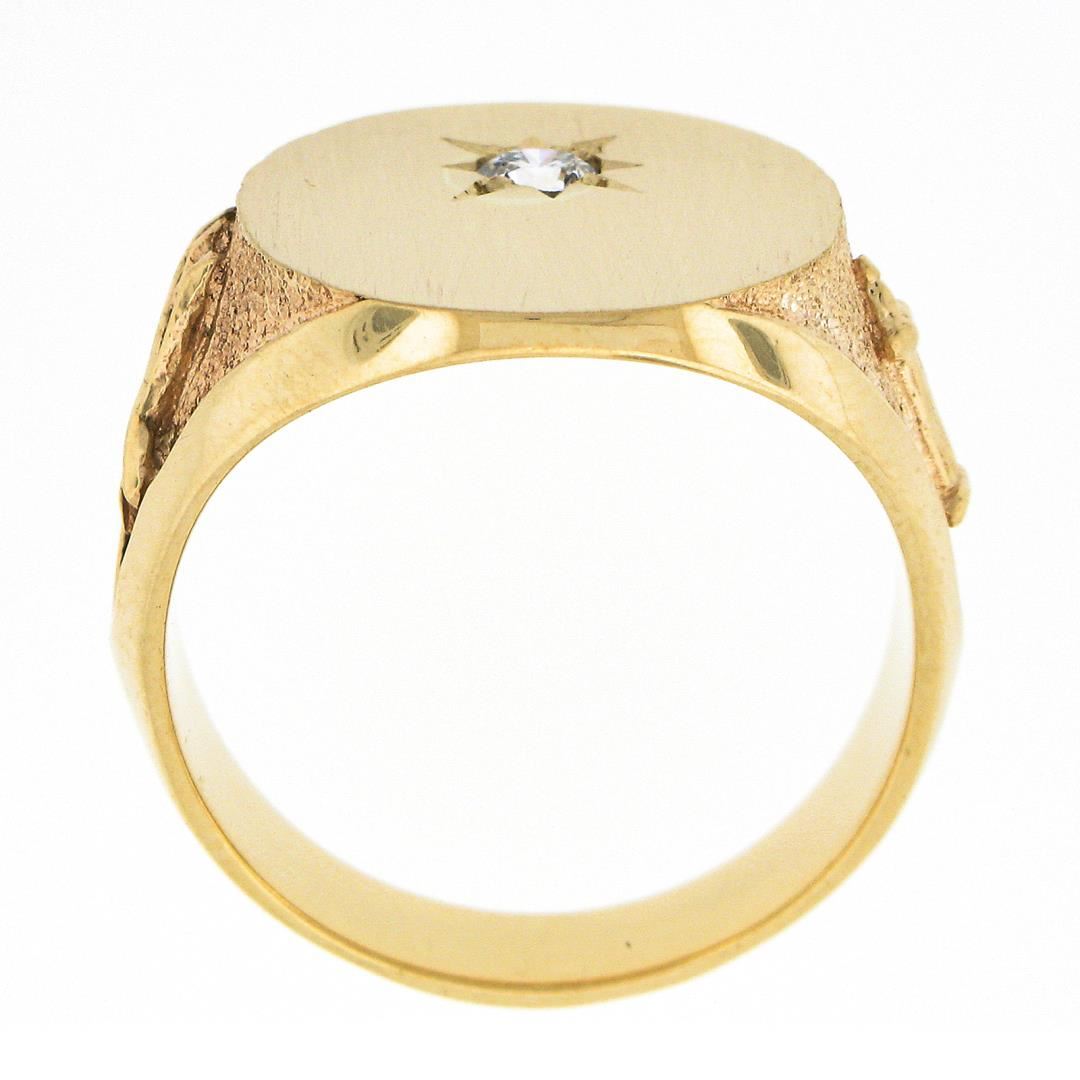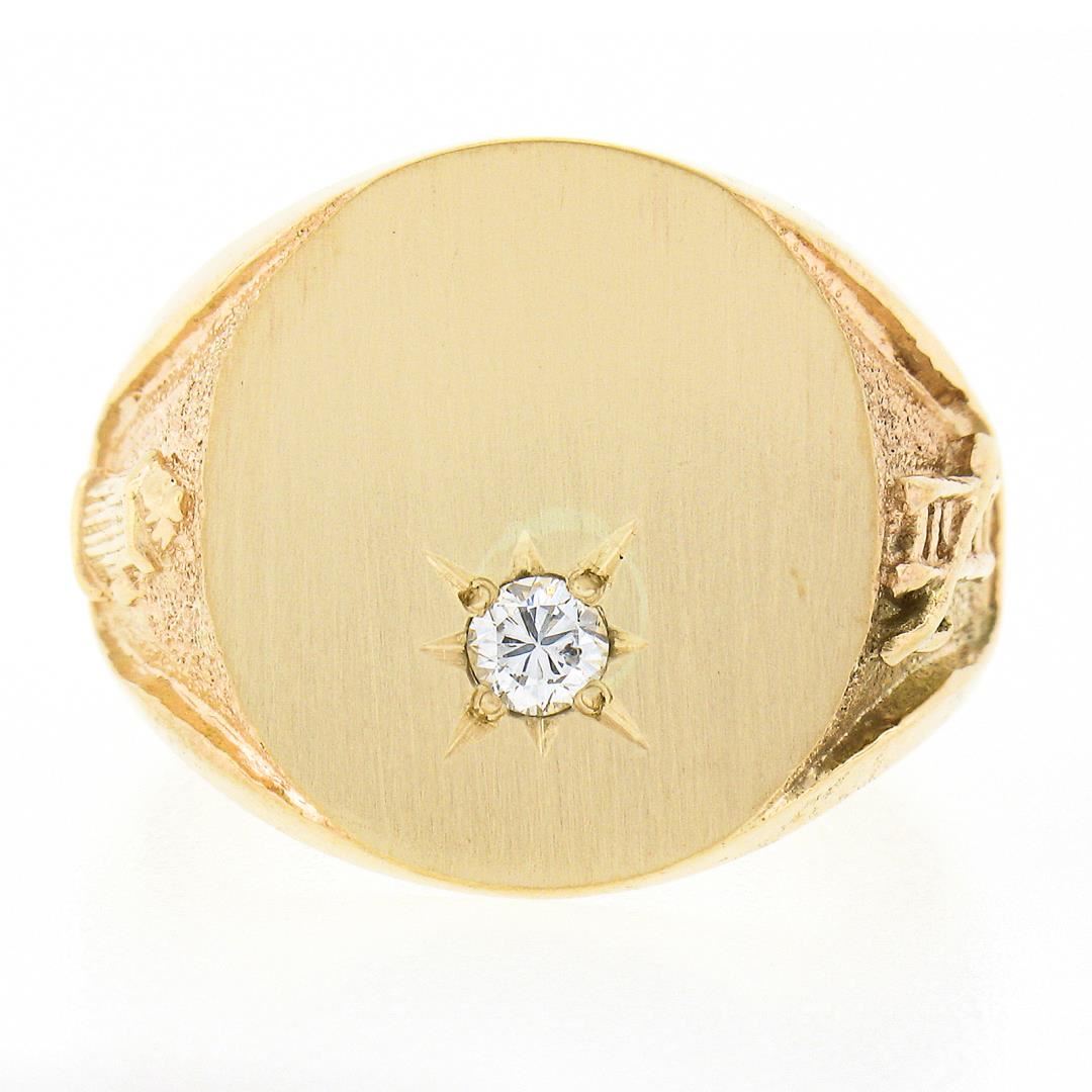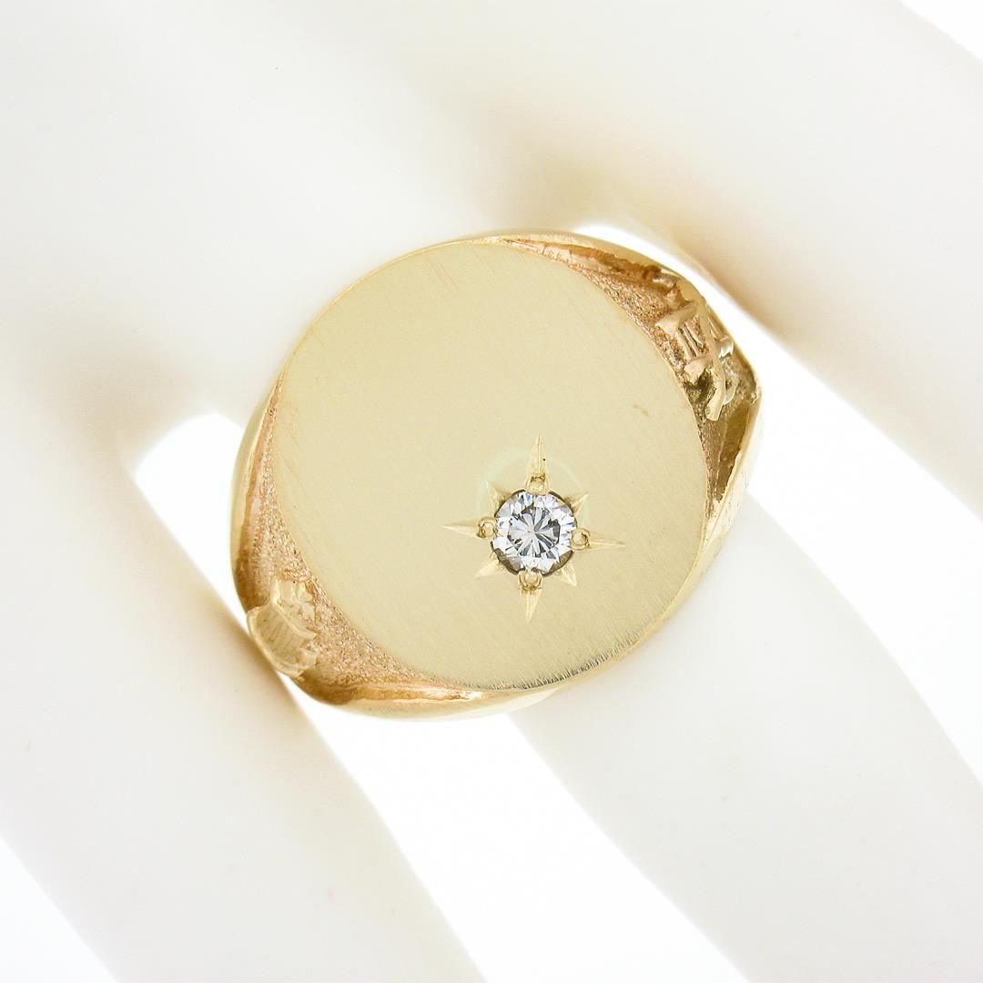 A solid 14k yellow gold oval signet ring, with 1 round brilliant cut natural diamond (G - SI1 - 0.17ct). The ring is size 11.5, weighs a total of 14.82 grams, and measures 19.20mm wide.