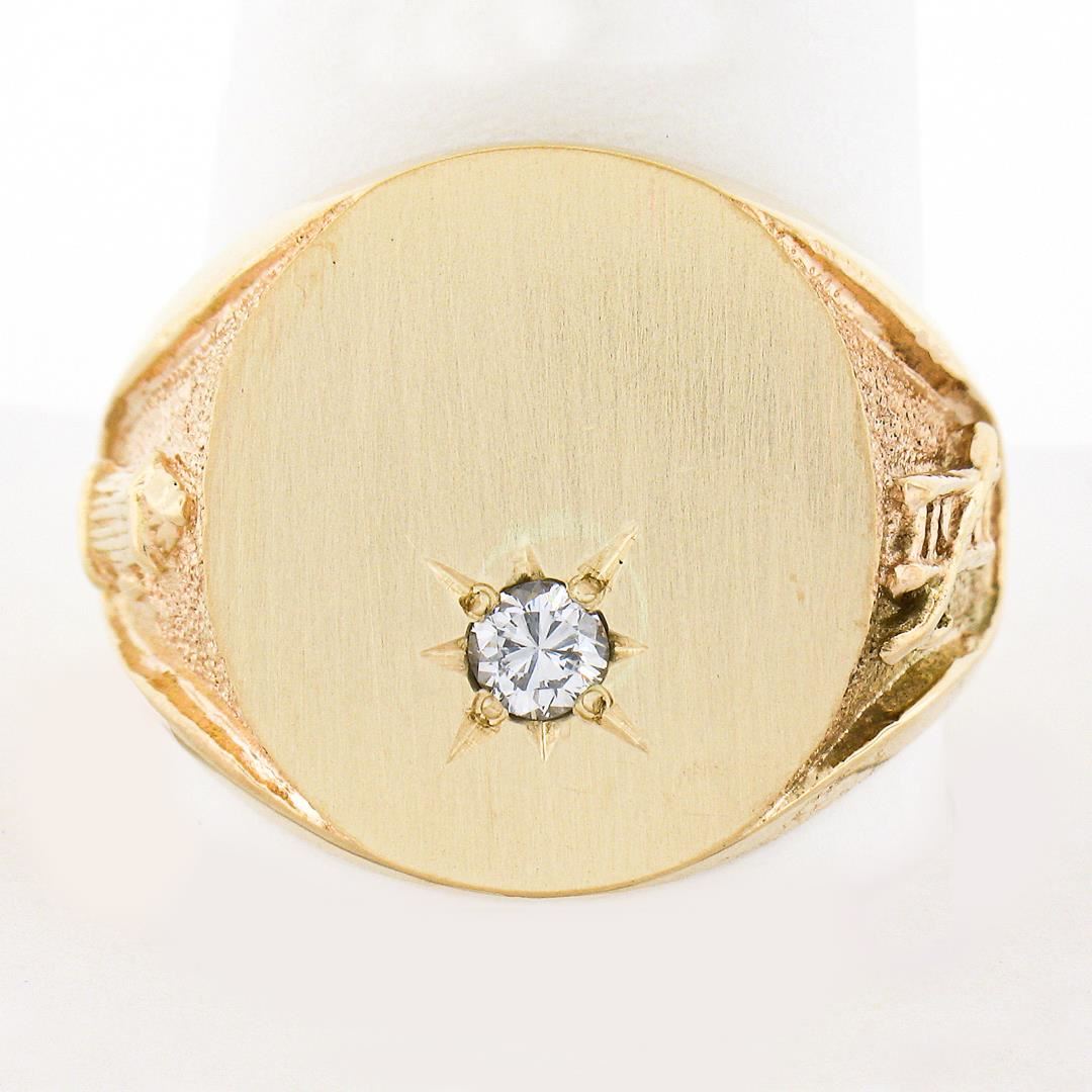 A solid 14k yellow gold oval signet ring, with 1 round brilliant cut natural diamond (G - SI1 - 0.17ct). The ring is size 11.5, weighs a total of 14.82 grams, and measures 19.20mm wide.