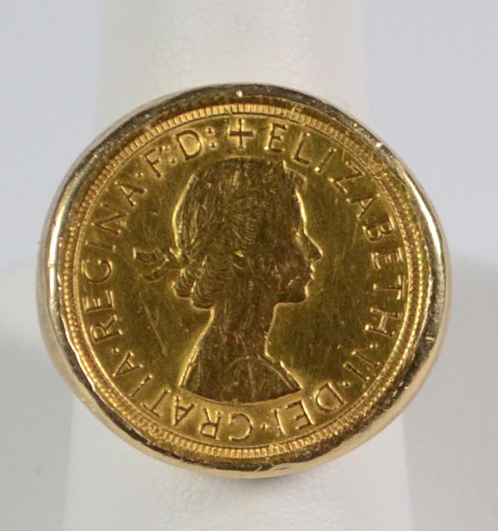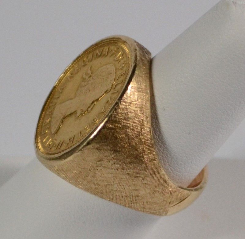 This is a gentleman's 14K gold ring with a Canadian Gold Sovereign Coin. Total weight of ring is .795 ozT.  Size 9.5. This is a Heavy ring! Est. $2000-$2500
