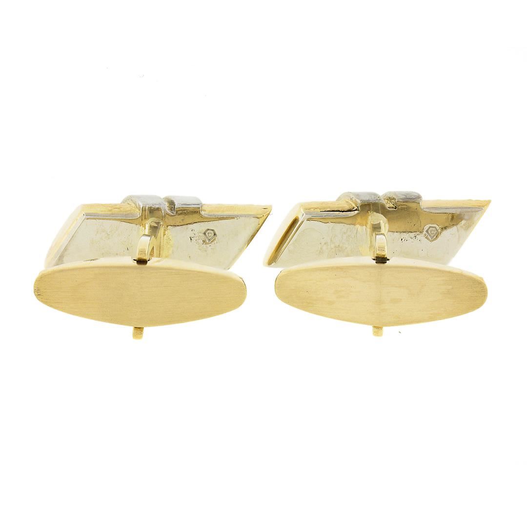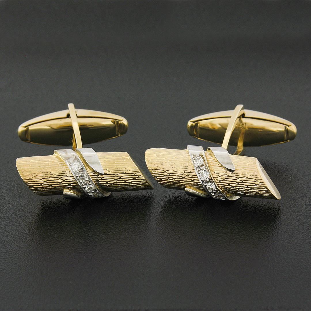 A solid 14k yellow & white gold cufflink, with 8 old single cut natural diamonds (H/I - SI1/SI2 ; 0.10ctw). These cuff links have a swivel design with a clearance of 14.4mm, weigh a total of 9.72 grams, and the front panels measure 16.1x8.4mm.