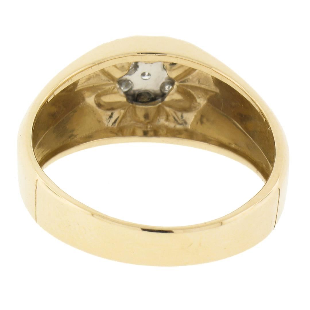 A solid 14k yellkow & white gold band ring, with 7 round cut natural diamonds (H-J - SI1/SI2 ; 0.20ctw ). The ring is size 10.0, weighs a total of 5.84 grams, and measures 10mm wide.