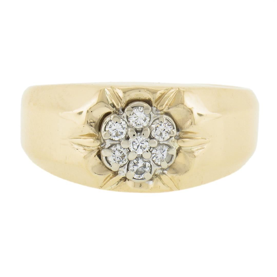 A solid 14k yellkow & white gold band ring, with 7 round cut natural diamonds (H-J - SI1/SI2 ; 0.20ctw ). The ring is size 10.0, weighs a total of 5.84 grams, and measures 10mm wide.