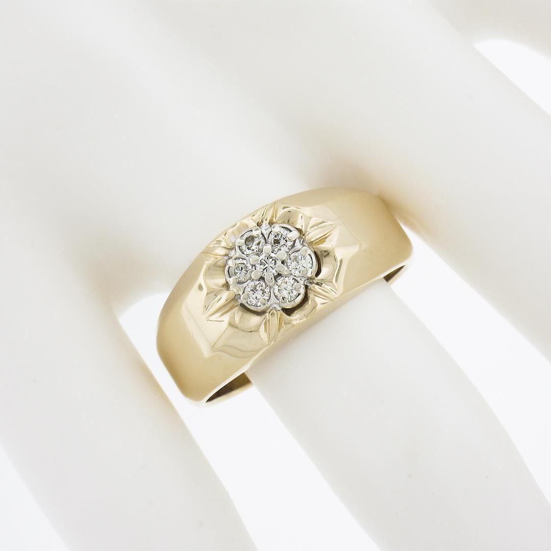 A solid 14k yellkow & white gold band ring, with 7 round cut natural diamonds (H-J - SI1/SI2 ; 0.20ctw ). The ring is size 10.0, weighs a total of 5.84 grams, and measures 10mm wide.