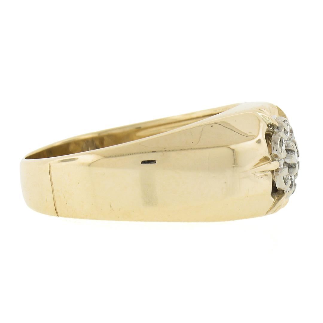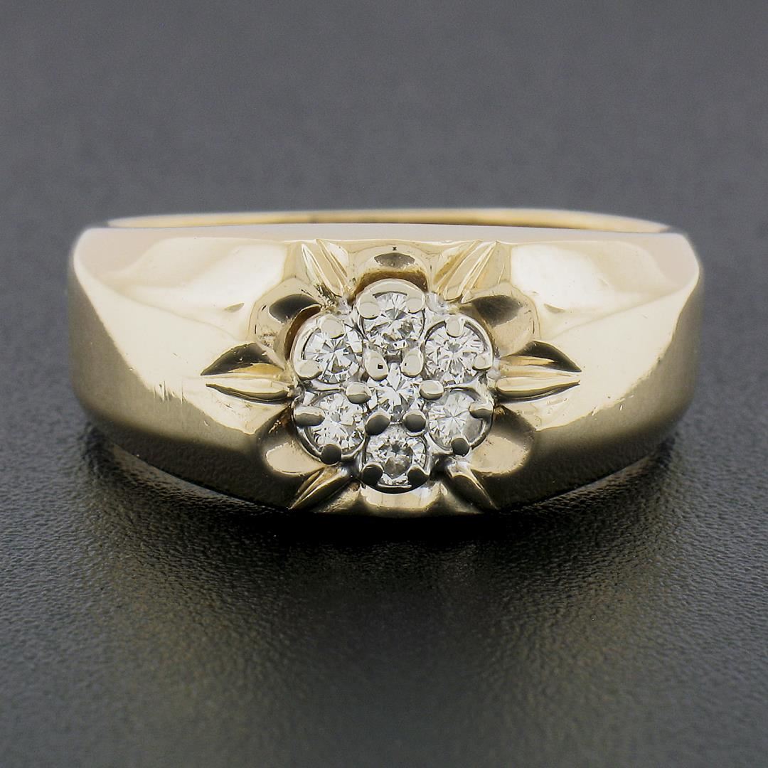 A solid 14k yellkow & white gold band ring, with 7 round cut natural diamonds (H-J - SI1/SI2 ; 0.20ctw ). The ring is size 10.0, weighs a total of 5.84 grams, and measures 10mm wide.