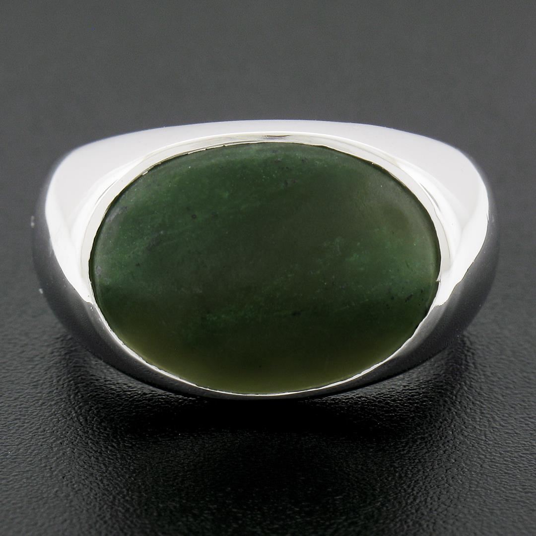 A solid 14k white gold band ring, with 1 oval cabochon cut natural nephrite jade (17.4x12.8mm). The ring is size 11.0, weighs a total of 15.14 grams, and measures 14.5mm wide.