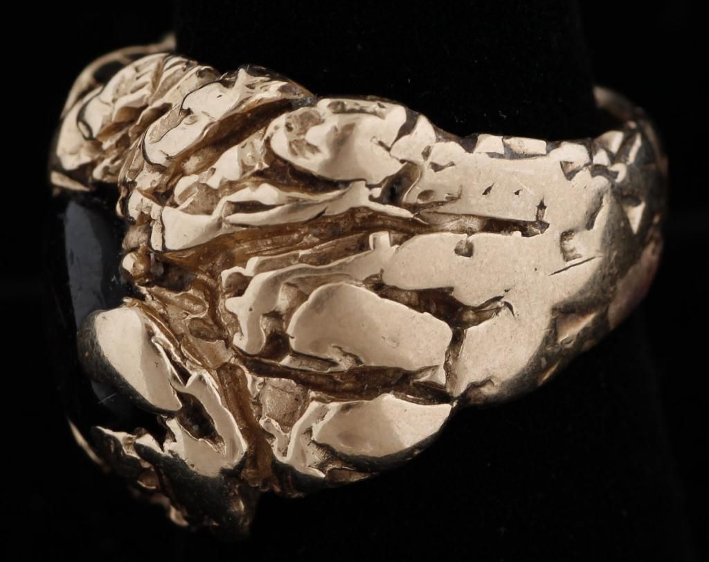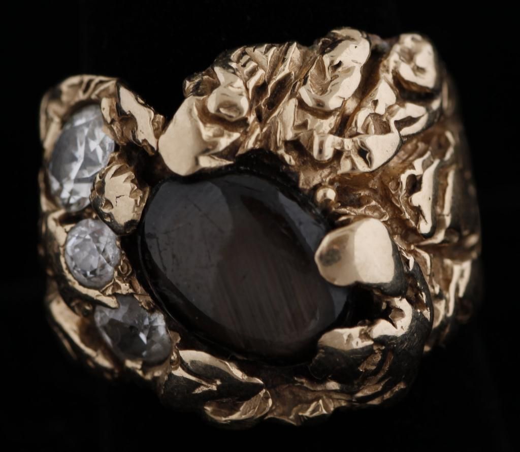 Men's 14K YG Black Star Sapphire RingNugget setting with 3 side diamonds.
