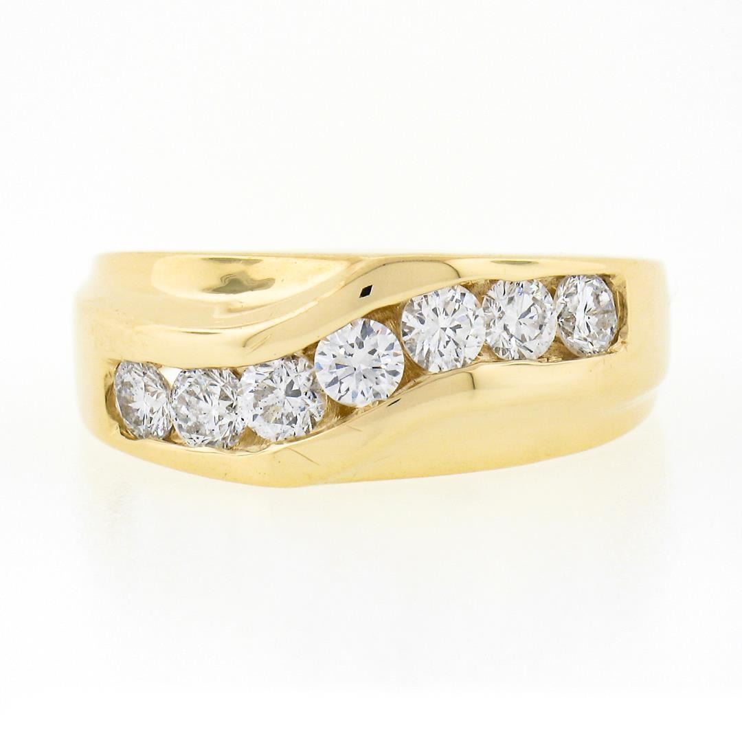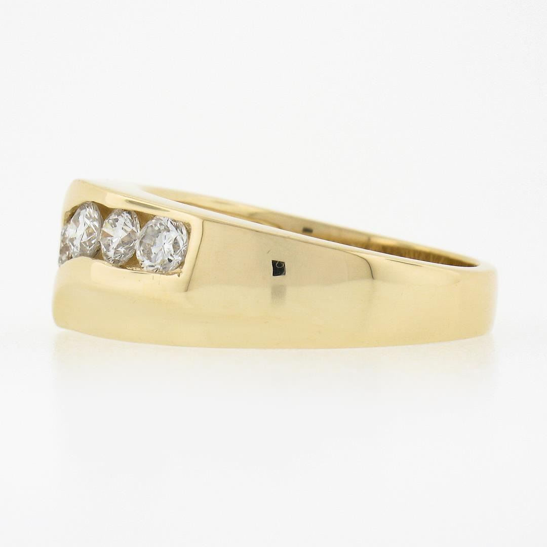 A solid 14k yellow gold men's band ring with 7 round brilliant cut natural diamonds (F/G- VS1/VS2 ; 1.10ctw). The ring is size 10.5, weighs a total of 8.98 grams, and measures 9mm wide.