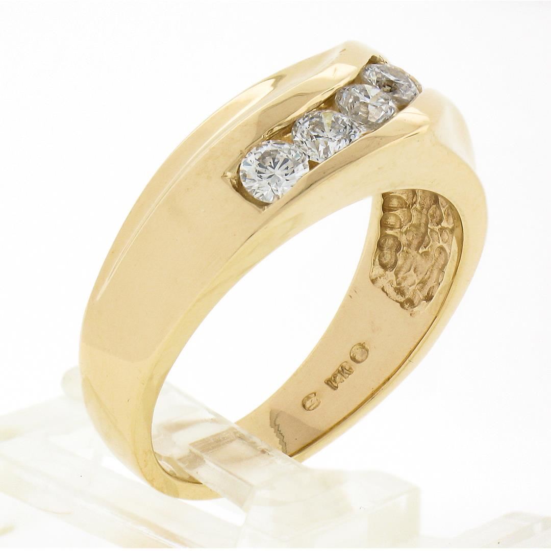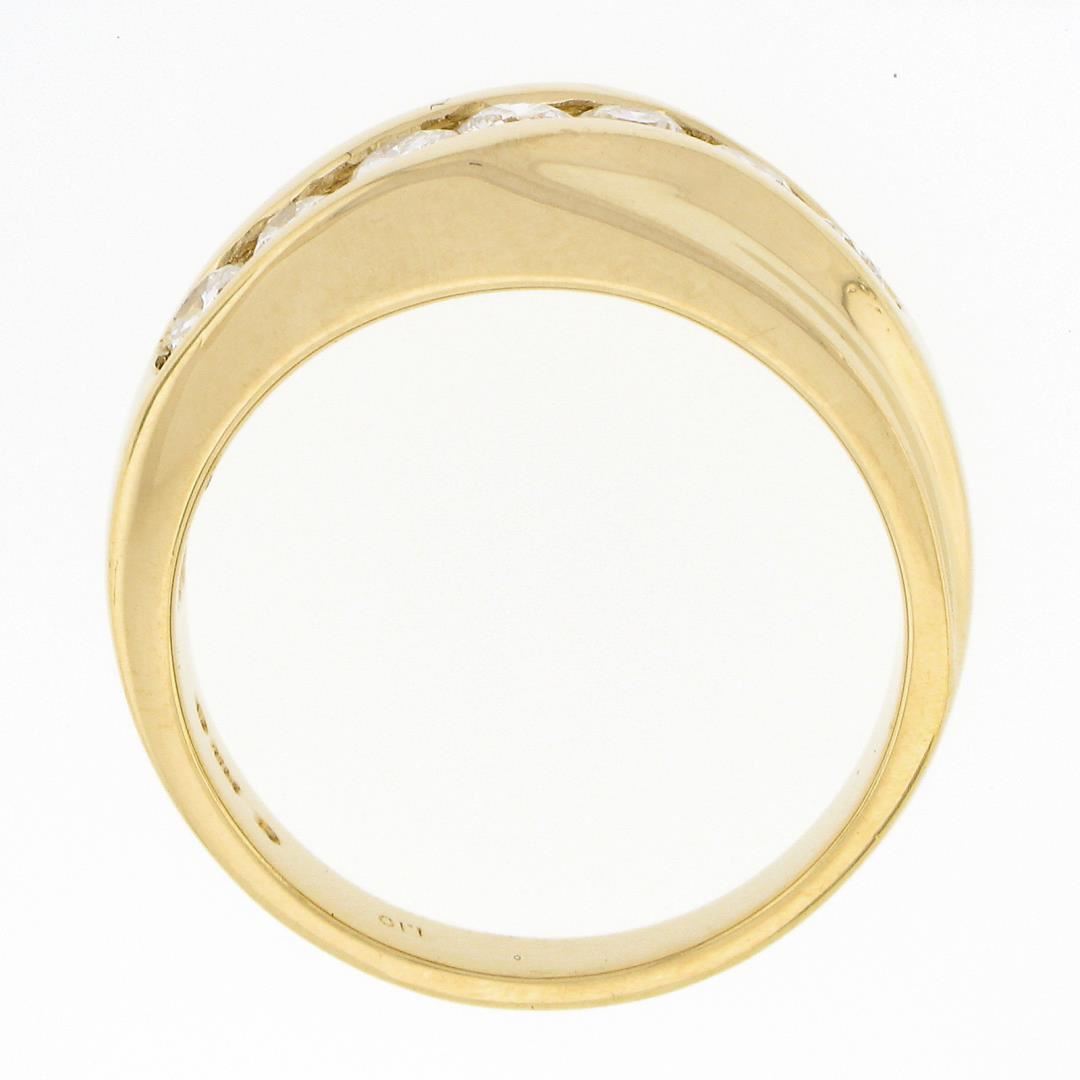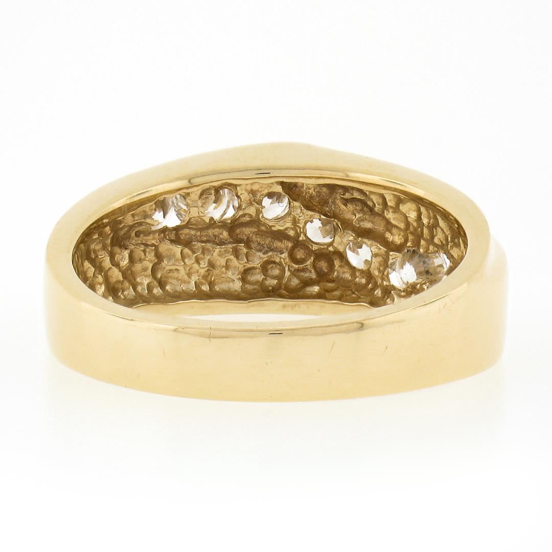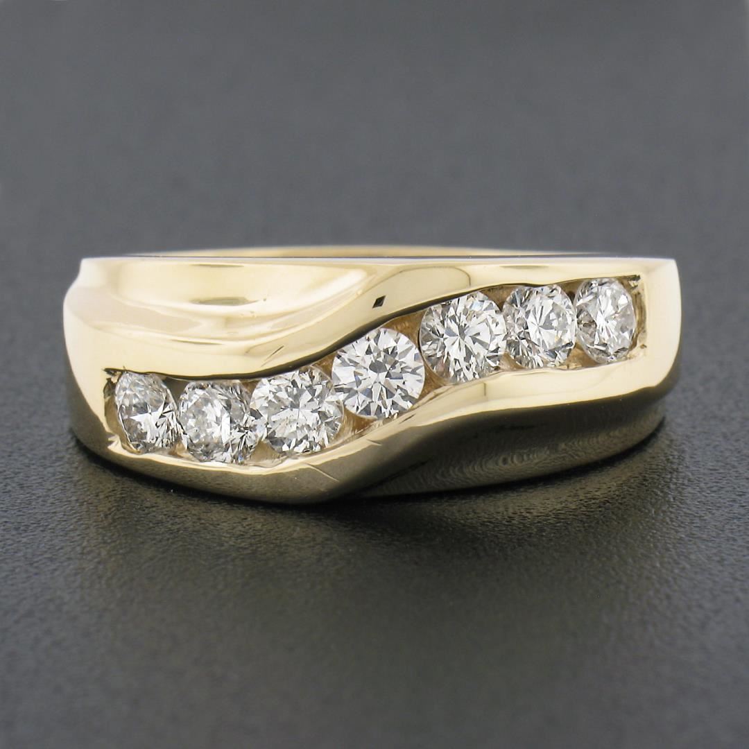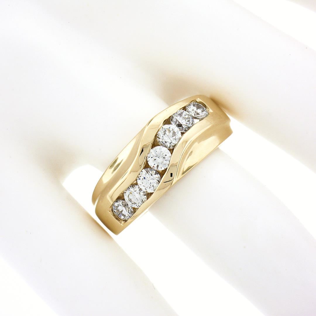 A solid 14k yellow gold men's band ring with 7 round brilliant cut natural diamonds (F/G- VS1/VS2 ; 1.10ctw). The ring is size 10.5, weighs a total of 8.98 grams, and measures 9mm wide.