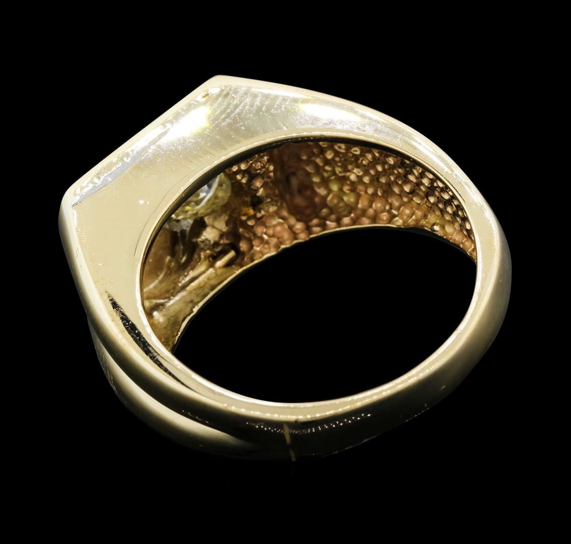 One electronically tested 14KT yellow gold man's cast fashion ring with a tapered shank with a bright polish finish. The featured man's ring has a shank measuring 3.10 millimeters wide. Identified with markings of "14K". Condition is new, good workmanship. Containing: One bezel set old mine cut diamond, measuring 5.80 - 5.70 x 2.60mm (depth est.) , 10.00.%. GTCF approximate weight of 0.60ct. Graded in the setting. Color J - K, Clarity VS-2 Cut Good. Total Weight of Diamonds 0.60ct. Total Weight of Ring 10.10gm. GAS Appraised.