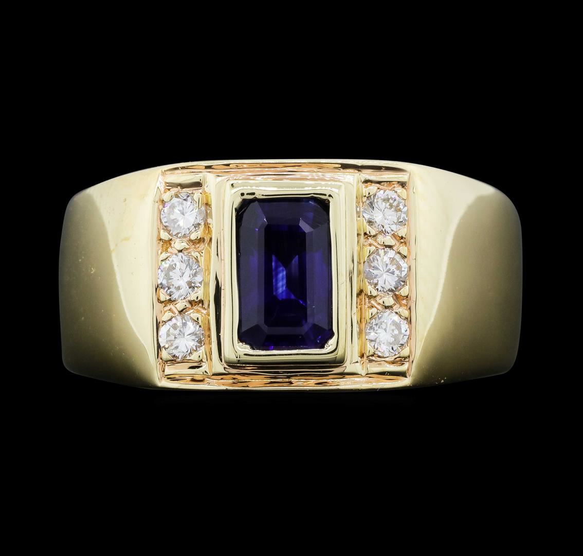 One electronically tested 14KT yellow gold man's cast fashion ring with a tapered wide band with a bright polish finish. The featured man's ring has a shank measuring 4.45 millimeters wide. Identified with markings of "14K". Condition is new, good workmanship. Containing: One bezel set emerald standard step cut natural blue sapphire, measuring 7.30 x 4.65 x 3.57mm, (depth est.) 5%. bulge factor, approximate weight of 1.40ct., clarity is slightly included, medium dark, strong, blue color, (GIA B 6/5), cut is very good. Transmitting light with no distortion, transparent. Colored gemstones are presumed to have been subjected to commonly used enhancement processes. Graded in the setting. Six prong set round brilliant cut diamonds, measuring 2.30 - 2.20 x 1.40mm (depth est.) approximate total weight of 6 Stones = 0.26ct. Graded in the setting. Color H - I Clarity VS-2 to SI-1 Cut Good. Total Weight of Colored Stones 1.40ct. Total Weight of Diamonds 0.26ct. Total Weight of Ring 11.80gm. GAS Appraised.