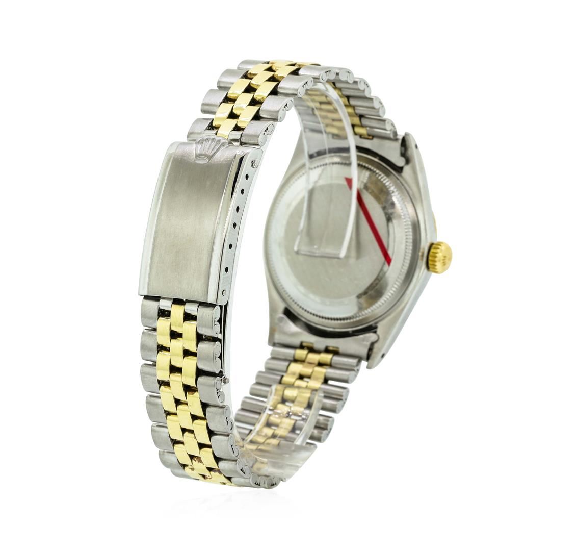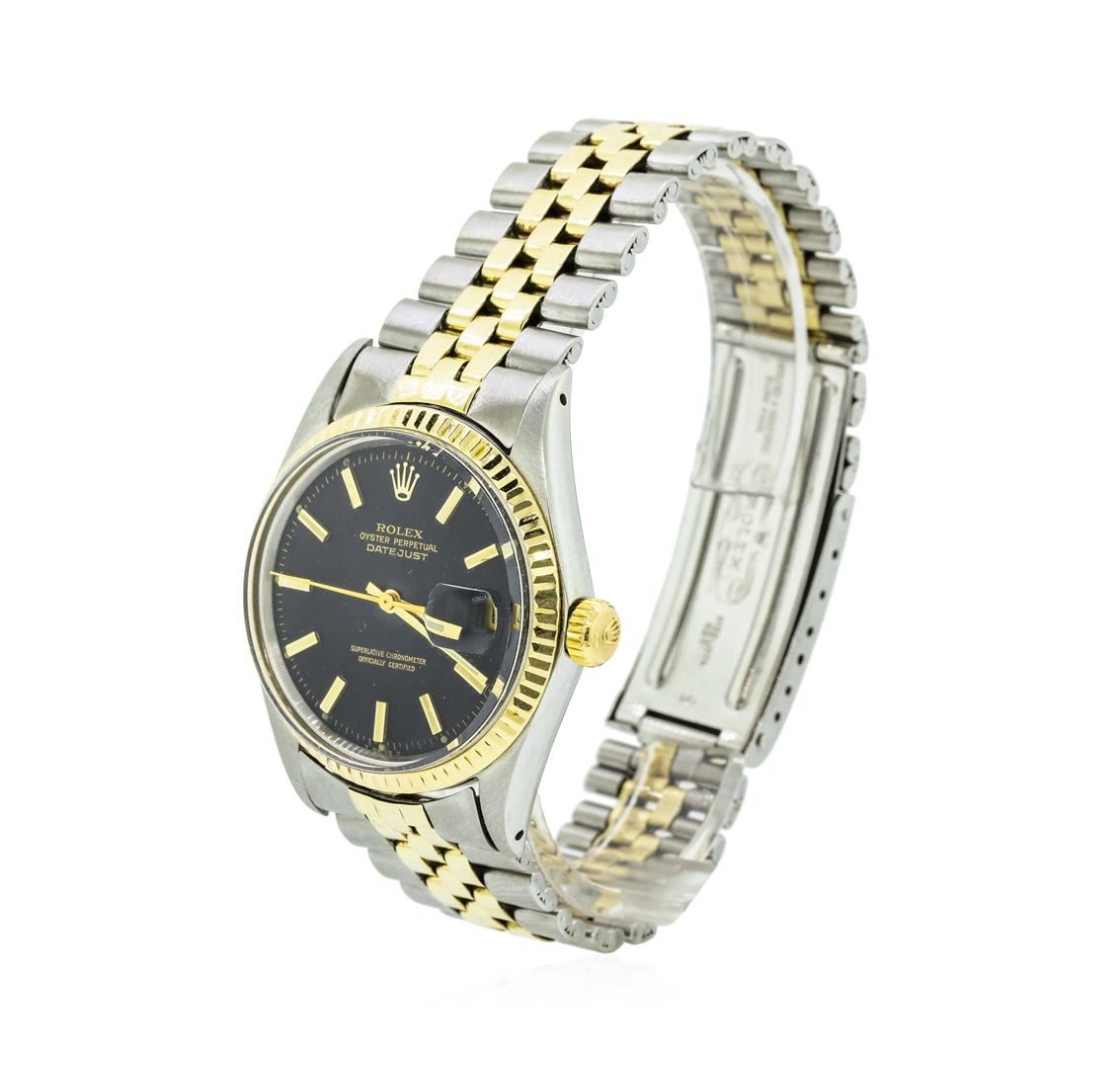 One, hand crafted & machine milled Rolex two-tone DateJust model wristwatch electro-chemically tested. Stainless Steel Case: 36mm oyster, Rolex signature 14KT Yellow gold Crown: twinlock with a high relief logo, 14KT Yellow gold Bezel: fluted, Crystal: acrylic cyclops lens, Circa: 1969.Movement: superlative chronometer, Rolex signed Dial: Flat Black color, with baton hands & raised indices, Date Window: 3 o'clock position non-quick set, Rolex Bracelet: two-tone stainless steel & 14KT yellow gold jubilee links, Condition: G-5 Fine. Seven and one half inch adjustable length. Rolex Hallmarked clasp. The bracelet and clasp are Rolex manufactured. In the past, Rolex has produced parts including clasps in locations other than Switzerland. That is why there is a variation to the look, feel, and weight of Rolex parts that were made in different areas of the world. Today, however all parts are produced in Switzerland. The clasp and bracelet of the watch in this appraisal were created for the Rolex market between 1965 and 1973.Total Weight of Watch 83.61gm. AIG Appraised.