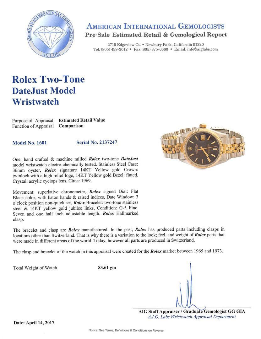 One, hand crafted & machine milled Rolex two-tone DateJust model wristwatch electro-chemically tested. Stainless Steel Case: 36mm oyster, Rolex signature 14KT Yellow gold Crown: twinlock with a high relief logo, 14KT Yellow gold Bezel: fluted, Crystal: acrylic cyclops lens, Circa: 1969.Movement: superlative chronometer, Rolex signed Dial: Flat Black color, with baton hands & raised indices, Date Window: 3 o'clock position non-quick set, Rolex Bracelet: two-tone stainless steel & 14KT yellow gold jubilee links, Condition: G-5 Fine. Seven and one half inch adjustable length. Rolex Hallmarked clasp. The bracelet and clasp are Rolex manufactured. In the past, Rolex has produced parts including clasps in locations other than Switzerland. That is why there is a variation to the look, feel, and weight of Rolex parts that were made in different areas of the world. Today, however all parts are produced in Switzerland. The clasp and bracelet of the watch in this appraisal were created for the Rolex market between 1965 and 1973.Total Weight of Watch 83.61gm. AIG Appraised.