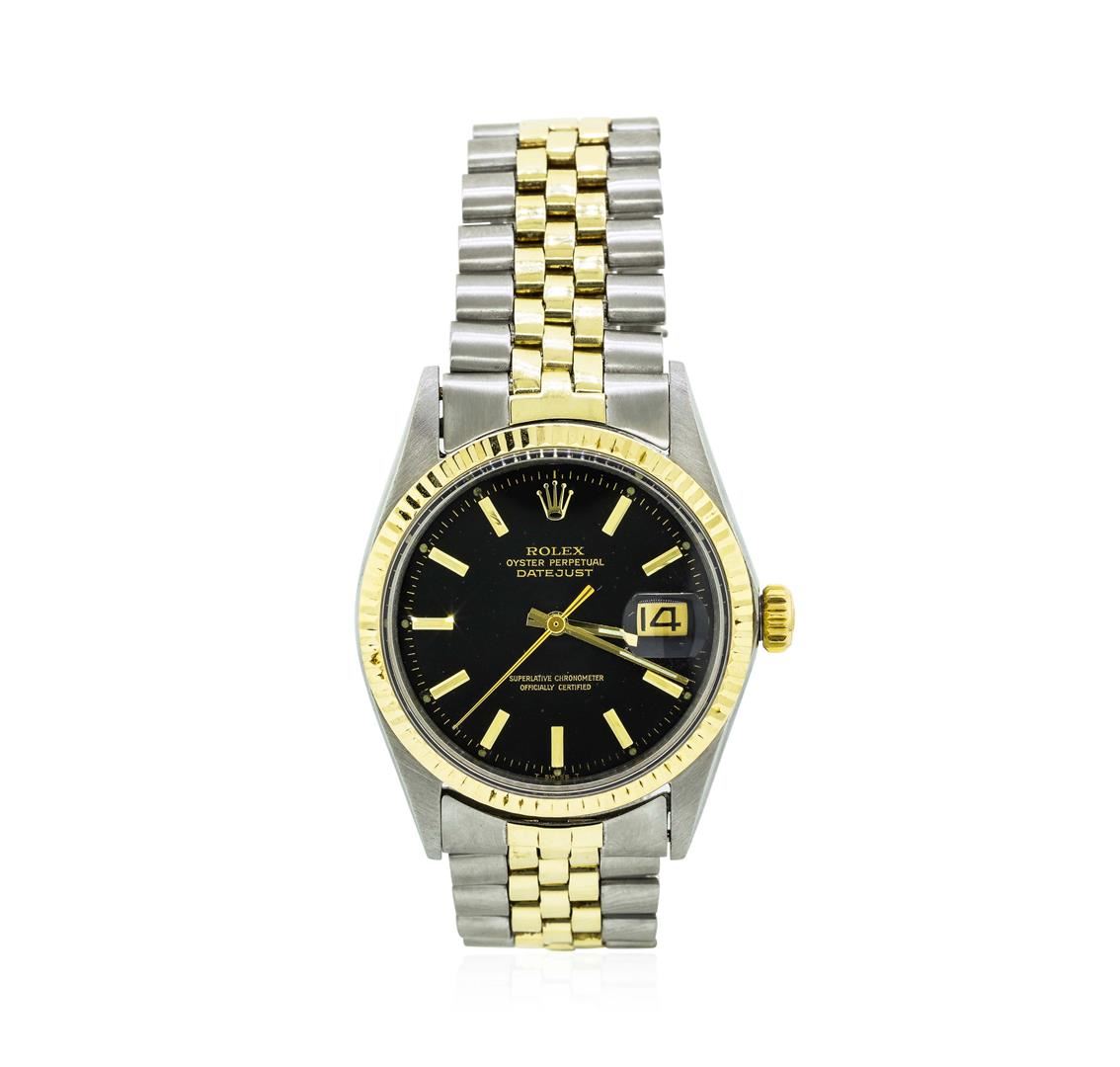 One, hand crafted & machine milled Rolex two-tone DateJust model wristwatch electro-chemically tested. Stainless Steel Case: 36mm oyster, Rolex signature 14KT Yellow gold Crown: twinlock with a high relief logo, 14KT Yellow gold Bezel: fluted, Crystal: acrylic cyclops lens, Circa: 1969.Movement: superlative chronometer, Rolex signed Dial: Flat Black color, with baton hands & raised indices, Date Window: 3 o'clock position non-quick set, Rolex Bracelet: two-tone stainless steel & 14KT yellow gold jubilee links, Condition: G-5 Fine. Seven and one half inch adjustable length. Rolex Hallmarked clasp. The bracelet and clasp are Rolex manufactured. In the past, Rolex has produced parts including clasps in locations other than Switzerland. That is why there is a variation to the look, feel, and weight of Rolex parts that were made in different areas of the world. Today, however all parts are produced in Switzerland. The clasp and bracelet of the watch in this appraisal were created for the Rolex market between 1965 and 1973.Total Weight of Watch 83.61gm. AIG Appraised.