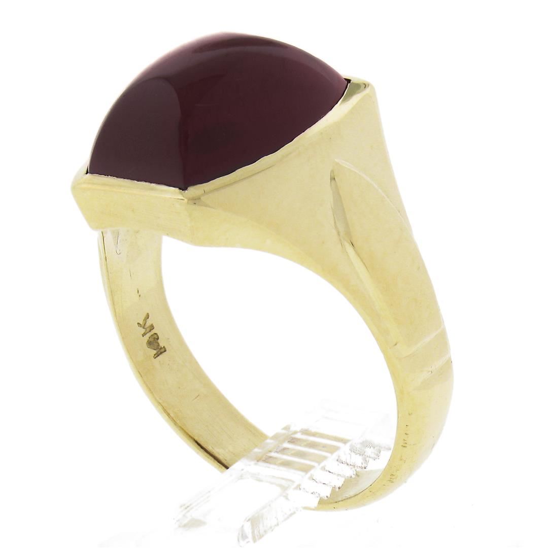 A solid 14k yellow gold men's ring, with 1 custom cabochon cut red stone (12.3x10.4mm). The ring is size 8.0, weighs a total of 5.86 grams, and measures 14.2mm wide.
