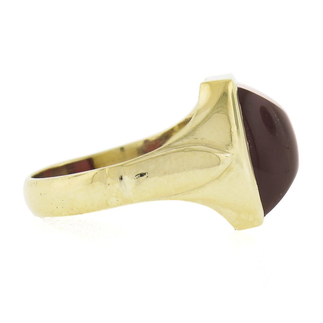 A solid 14k yellow gold men's ring, with 1 custom cabochon cut red stone (12.3x10.4mm). The ring is size 8.0, weighs a total of 5.86 grams, and measures 14.2mm wide.
