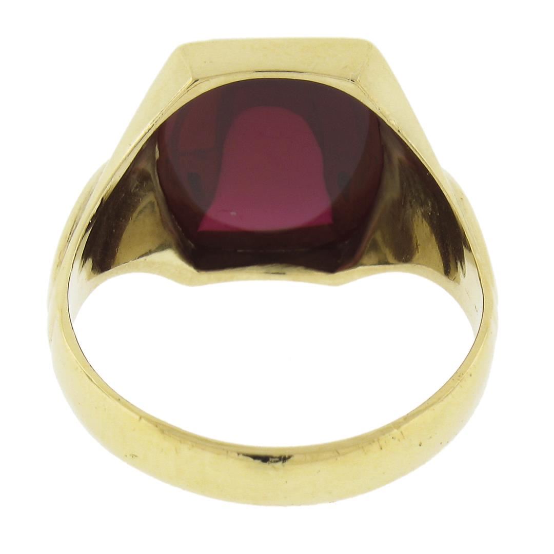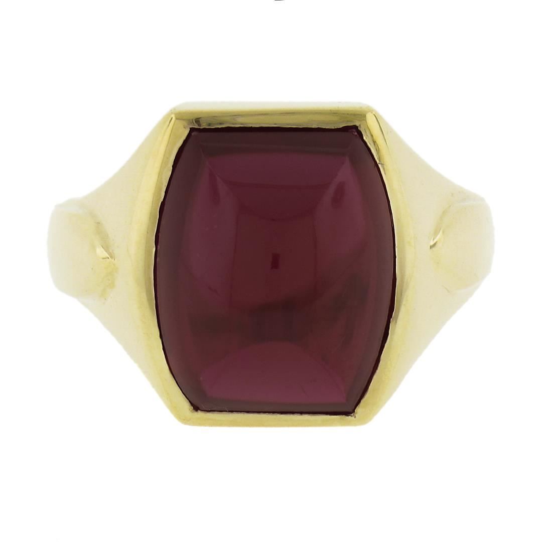 A solid 14k yellow gold men's ring, with 1 custom cabochon cut red stone (12.3x10.4mm). The ring is size 8.0, weighs a total of 5.86 grams, and measures 14.2mm wide.