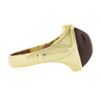 A solid 14k yellow gold men's ring, with 1 custom cabochon cut red stone (12.3x10.4mm). The ring is size 8.0, weighs a total of 5.86 grams, and measures 14.2mm wide.