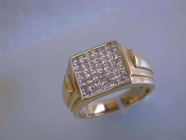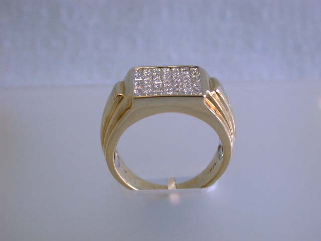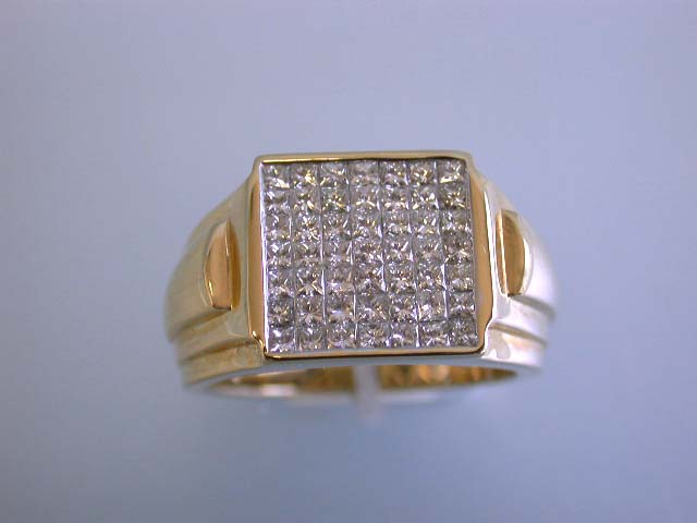 14k Gold Ring w/ Diamonds. This is a 14k Gold Men's Ring w/ 49 pieces of Princess Cut Diamonds with a total of 1.50 carats in G color and VS clarity. The size of this is 10 and weighs 11.13 grams.
