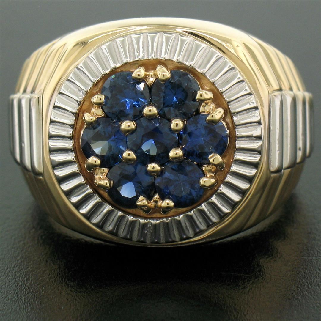 One QUALITY Men's 14k Two Tone Gold 2.50ctw Round Sapphire Cluster Ribbed Band Ring. Item Details: Material: 14K Solid Yellow and White Gold, Weight: 21.01 Grams, Stone(s): (7) Natural Genuine Sapphires - Round Brilliant Cut - Prong Set - Rich Royal Blue Color, Total Carat Weight: 2.50 (approx.), Ring Size: 9.0, Ring Width: 18.40mm, Ring Height: 8.67mm rise off the finger, Condition: Like New!