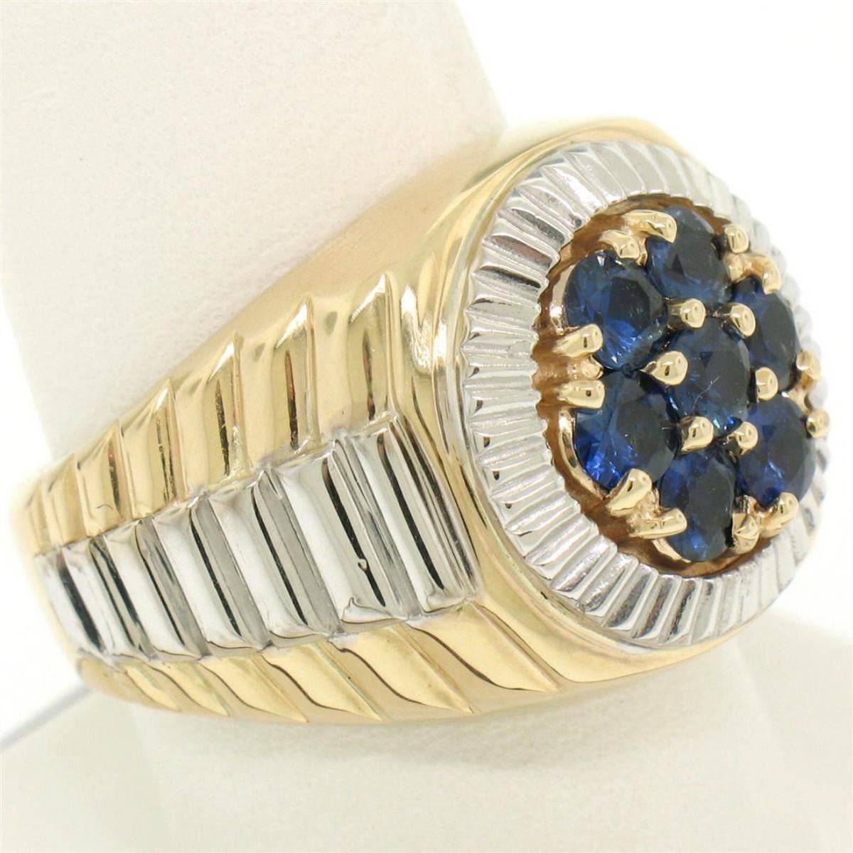 One QUALITY Men's 14k Two Tone Gold 2.50ctw Round Sapphire Cluster Ribbed Band Ring. Item Details: Material: 14K Solid Yellow and White Gold, Weight: 21.01 Grams, Stone(s): (7) Natural Genuine Sapphires - Round Brilliant Cut - Prong Set - Rich Royal Blue Color, Total Carat Weight: 2.50 (approx.), Ring Size: 9.0, Ring Width: 18.40mm, Ring Height: 8.67mm rise off the finger, Condition: Like New!