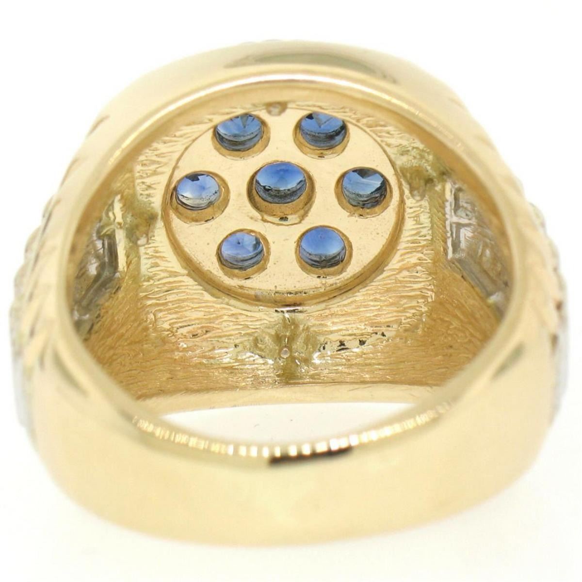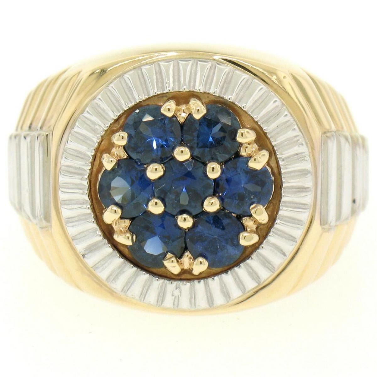 One QUALITY Men's 14k Two Tone Gold 2.50 ctw Round Sapphire Cluster Ribbed Band Ring. Item Details: Material: 14K Solid Yellow and White Gold, Weight: 21.01 Grams, Stone(s): (7) Natural Genuine Sapphires - Round Brilliant Cut - Prong Set - Rich Royal Blue Color, Total Carat Weight: 2.50 (approx.), Ring Size: 9.0, Ring Width: 18.40mm, Ring Height: 8.67mm rise off the finger, Condition: Like New!