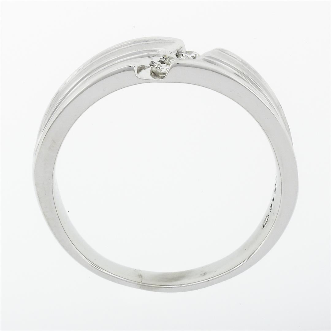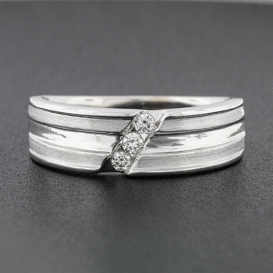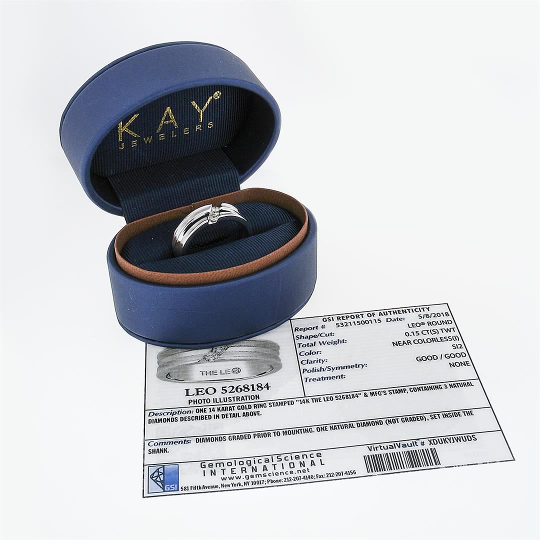 A solid 14 white gold men's band ring, with 3 LEO® round brilliant cut natural diamonds (I- SI2; 0.15ctw). The ring is size 12.5, weighs a total of 9.71 grams, and measures 7.7mm wide.