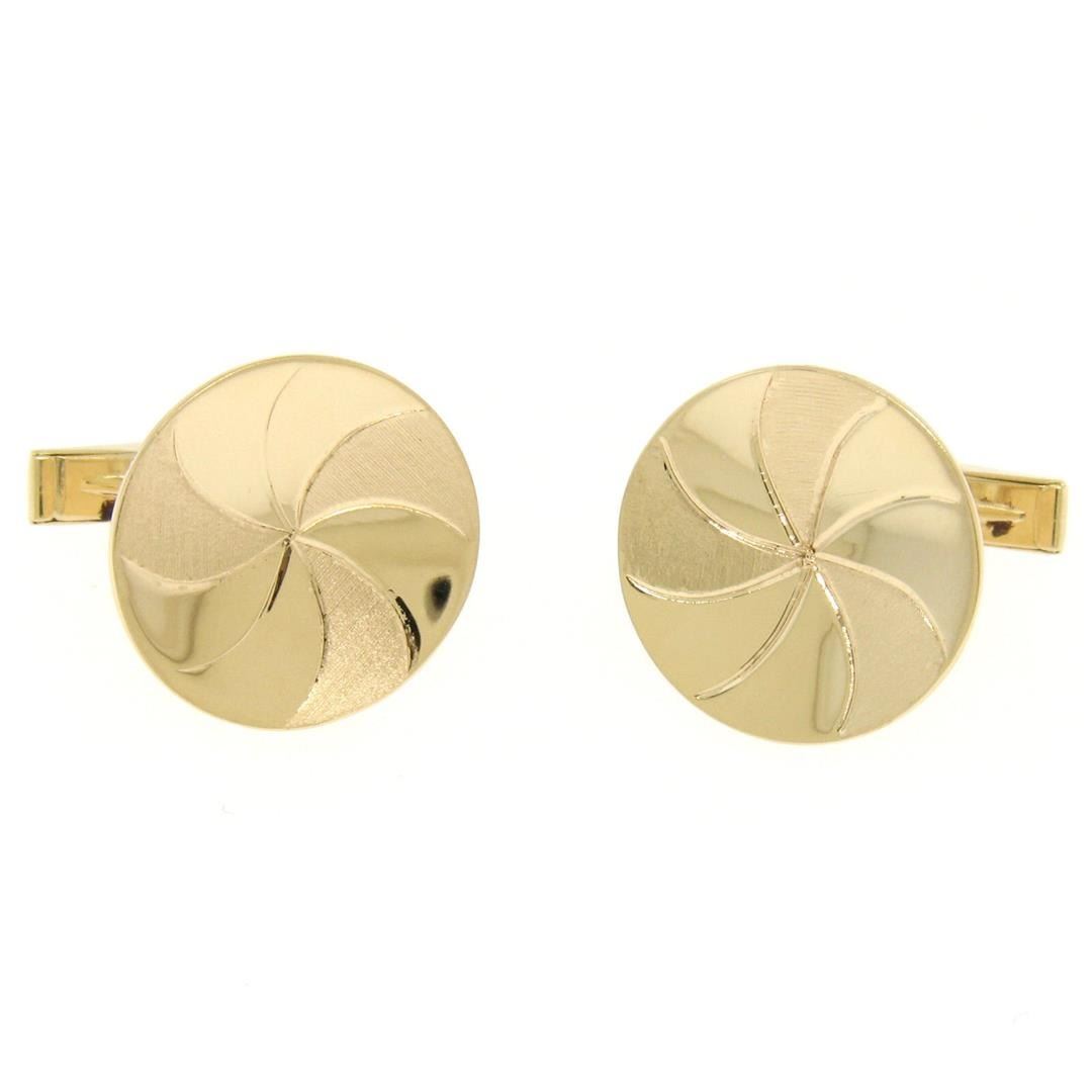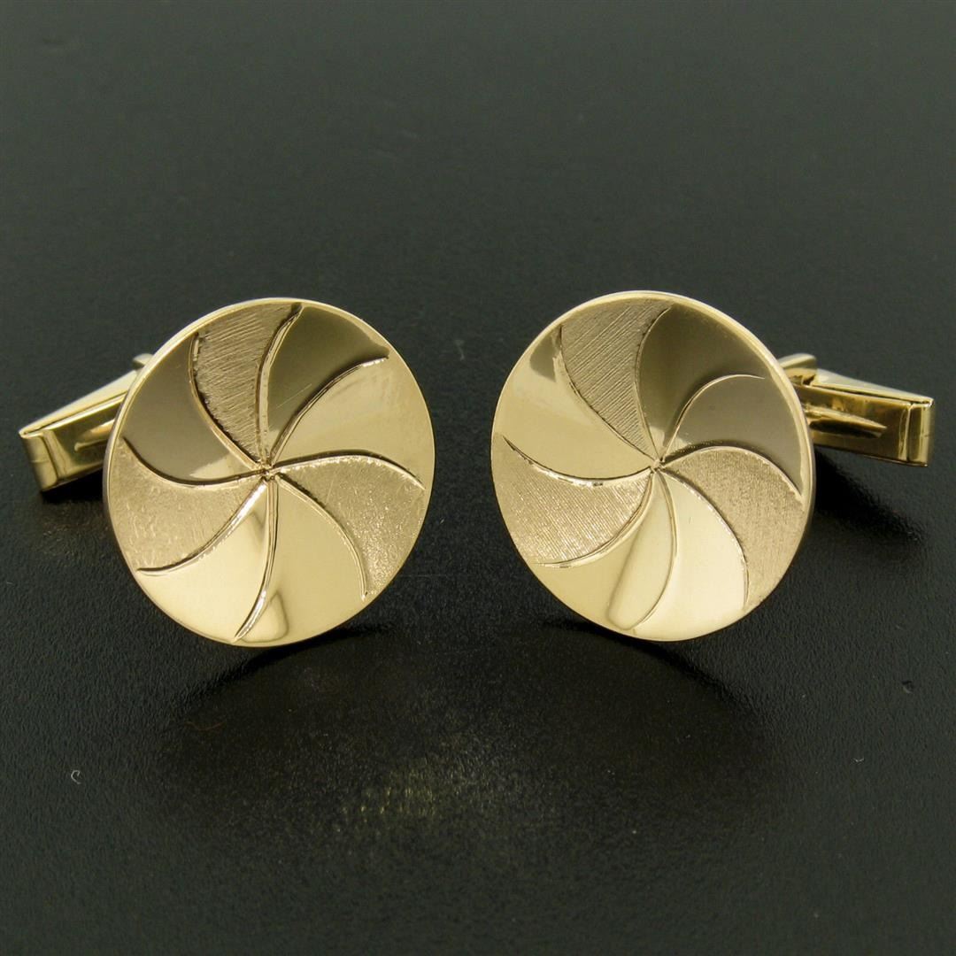 An estate 14k yellow gold concave swirl cufflinks, These cuff links have a swivel design with a clearance of 14.50mm, weigh a total of 11.1 grams, and the front panels measure 19.92mm in diameter.
