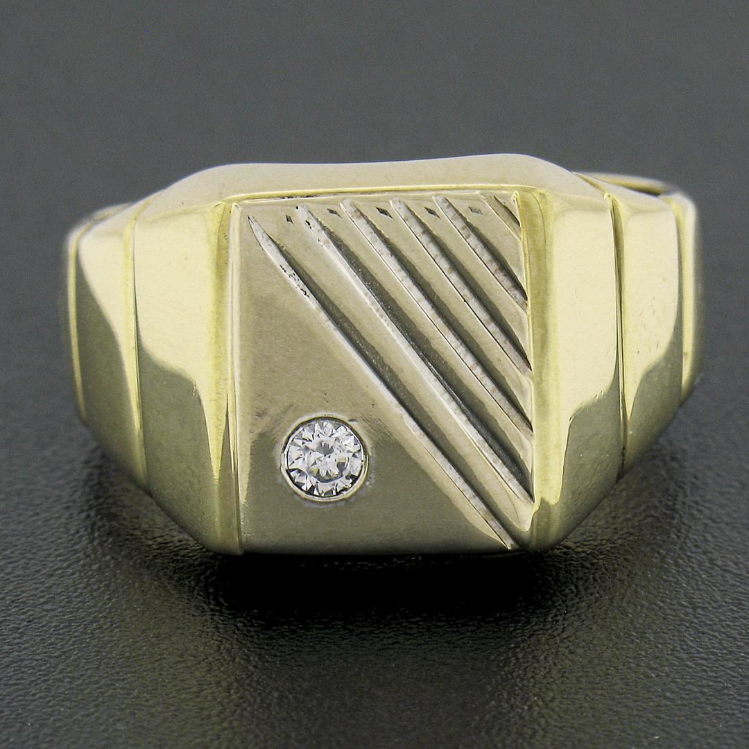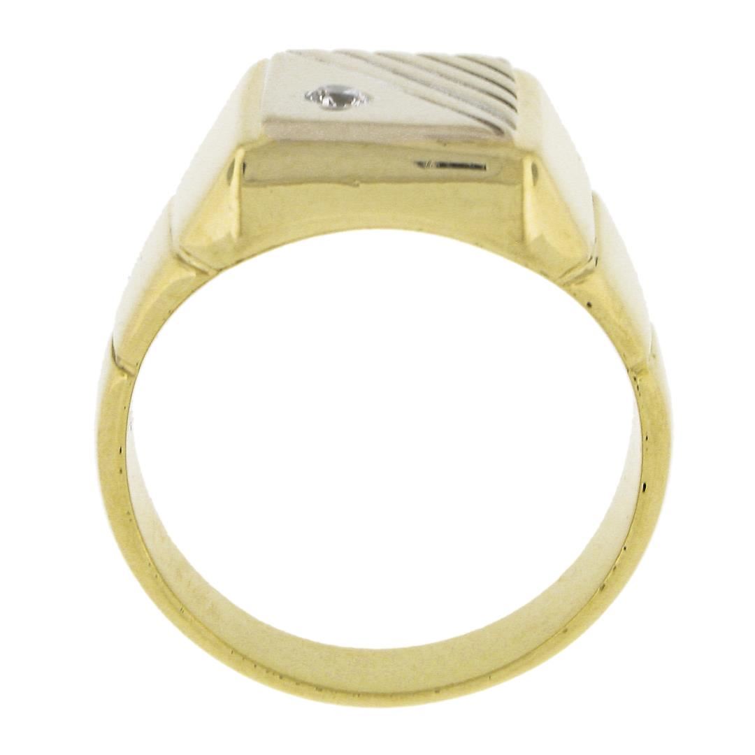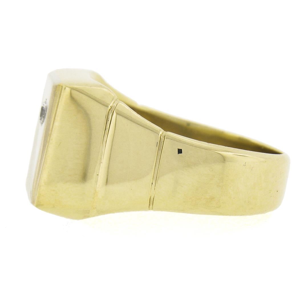 A solid 14k yellow gold men's signet ring, featuring 1 round cut cubic zircon. The ring is size 10.0, weighs a total of 9.19 grams, and measures 13.6mm wide.