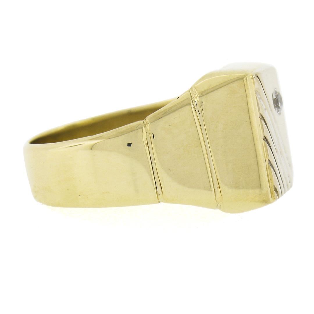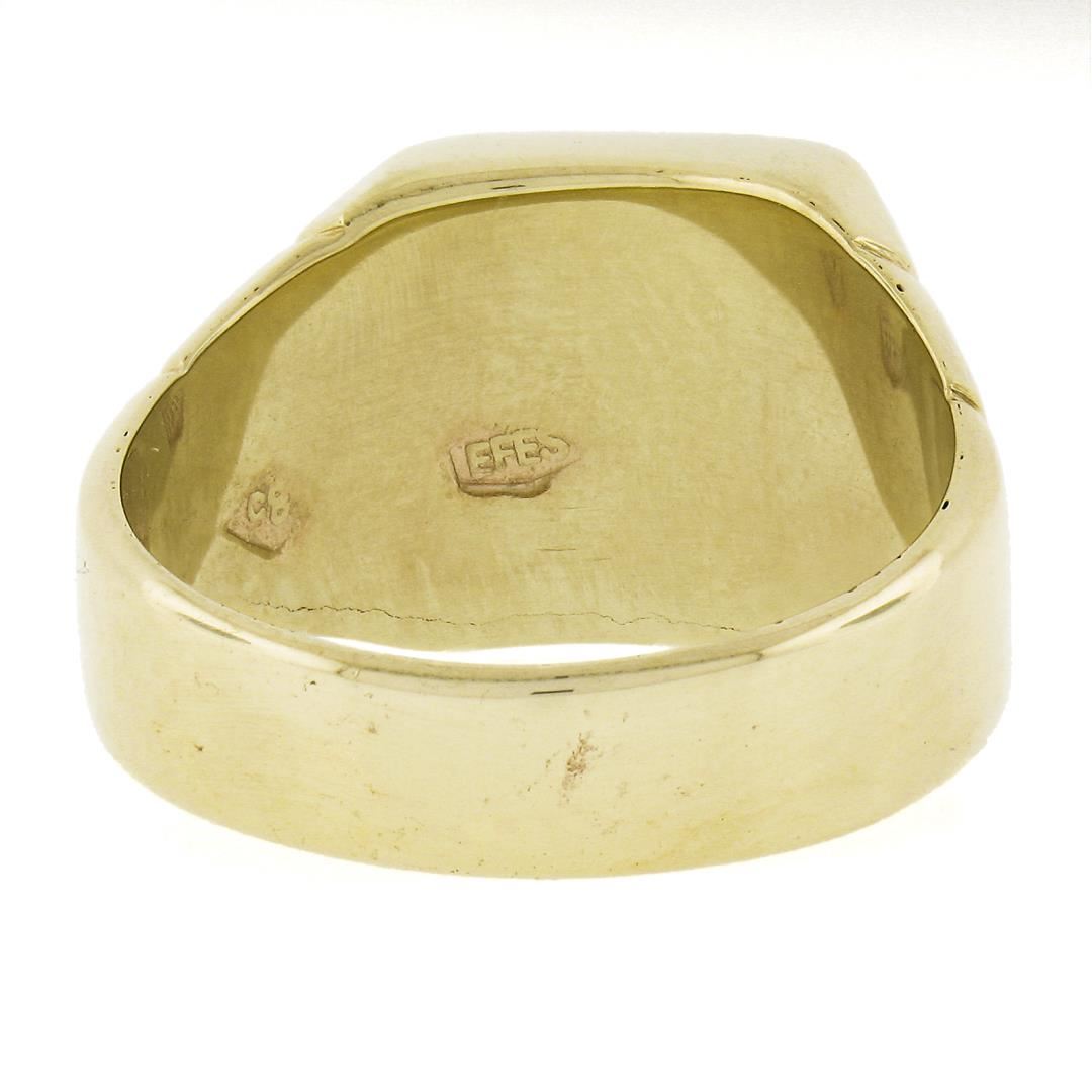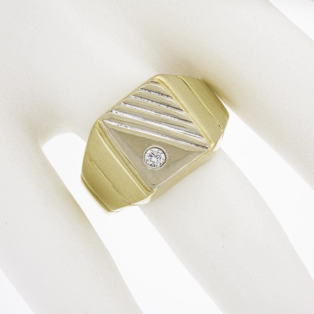 A solid 14k yellow gold men's signet ring, featuring 1 round cut cubic zircon. The ring is size 10.0, weighs a total of 9.19 grams, and measures 13.6mm wide.