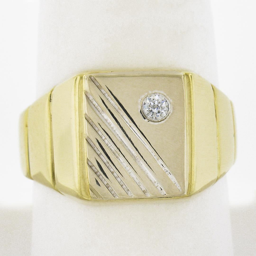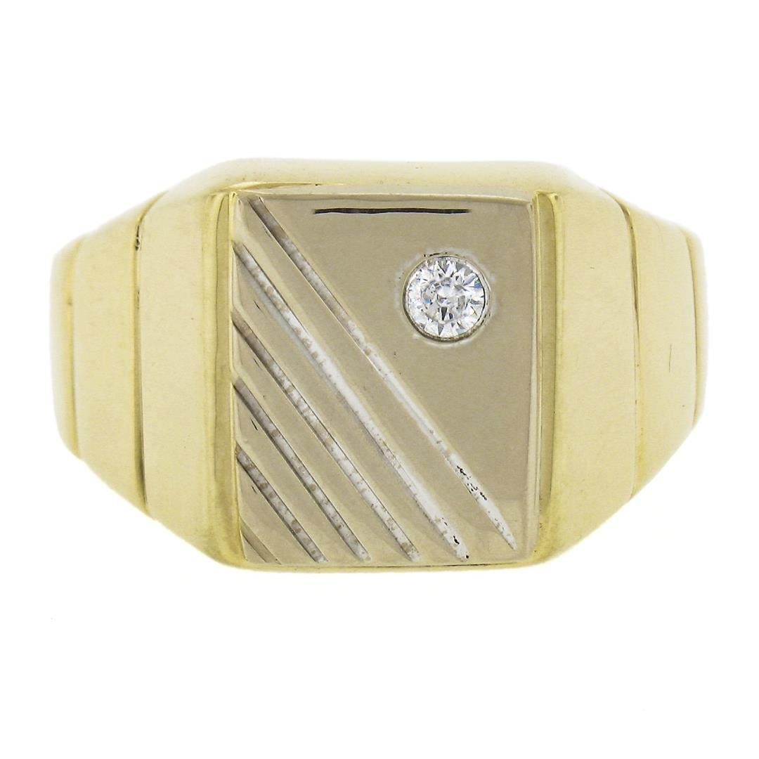 A solid 14k yellow gold men's signet ring, featuring 1 round cut cubic zircon. The ring is size 10.0, weighs a total of 9.19 grams, and measures 13.6mm wide.