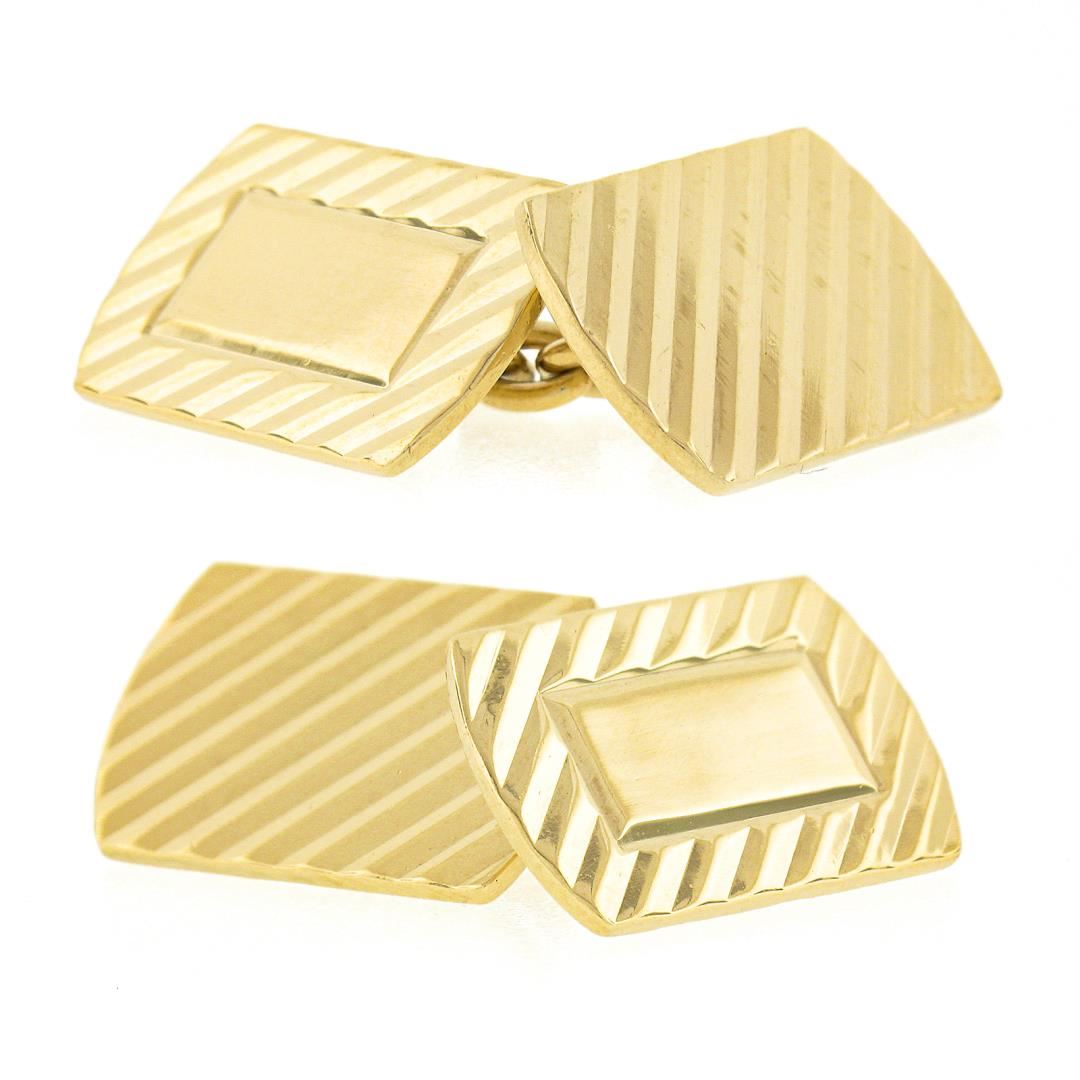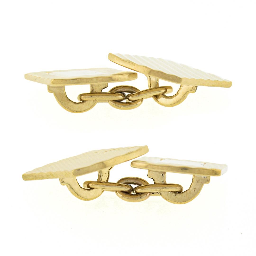 A solid 14k yellow gold cufflinks. These cuff links have a chain link design with a clearance of 16mm, weigh a total of 10.56 grams, and the front panels measure 17.1x11.4mm.